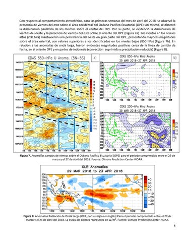 Figura 8. Anomalías Radiación de Onda Larga (OLR, por sus siglas en inglés) Para el periodo comprendido entre el 29 de marzo y el 23 de abril del 2018. La escala de colores representa en W/m2. Fuente: Climate Prediction Center-NOAA. 8