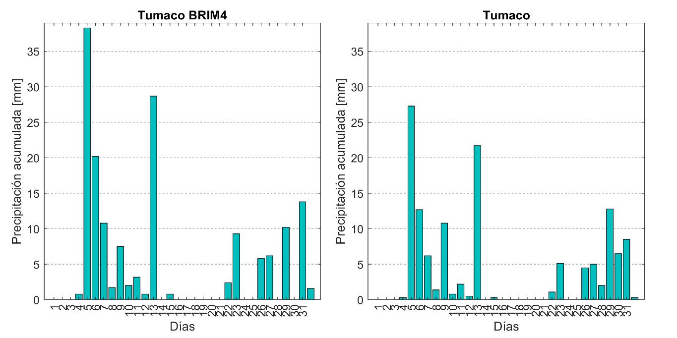 Precipitación acumulada (mm) Parámetro Tumaco Tumaco BRIM4 Candelilla de la Mar Máximo acumulado diario 27.3 38.3 N/A Acumulado total mensual 130 164.1 N/A Días con lluvia 19 17 N/A Total de datos 4.378 4.247 N/A