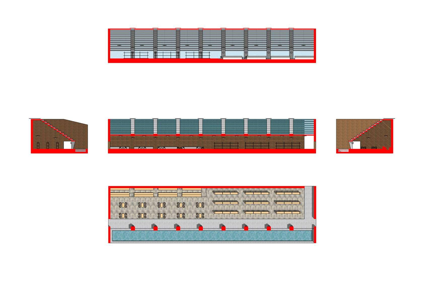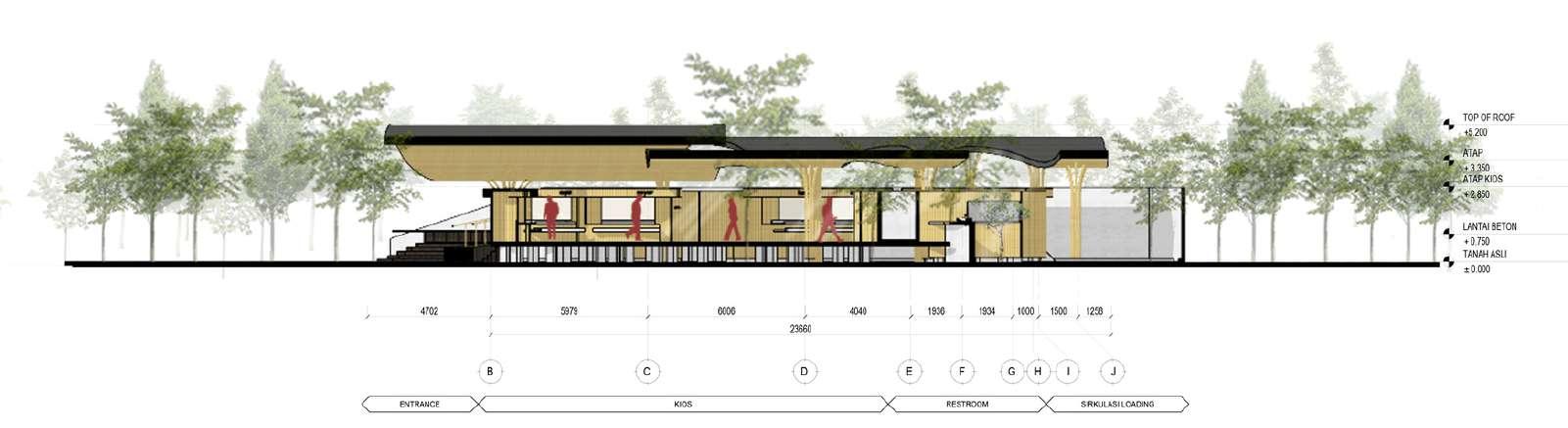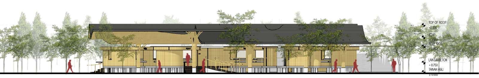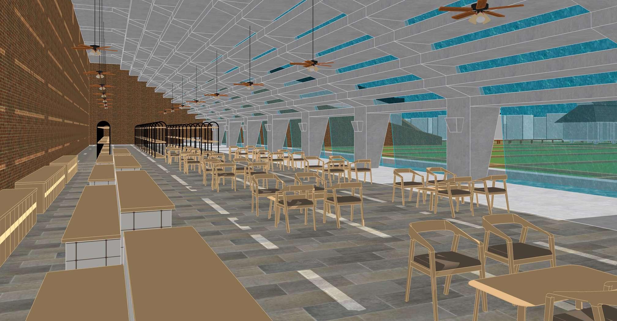 Setelah gedung literasi, sekuen berikutnya adaah gedung restoran & cenderamata. Gedung ini mei k pemandangan persawahan Orentasi menghadap barat, sehngga teriknya sinar matahari d fiter dengan ar yang terun melau atap berundak - turun ke kolam penampungan Sedangkan d balknya adaah lingkungan homestay Ornentasi menghadap timur untuk memaksimakan snar matahar pag yang menyehatkan Memi k ftur alun - alun, pemandangannya sungai dan sawah