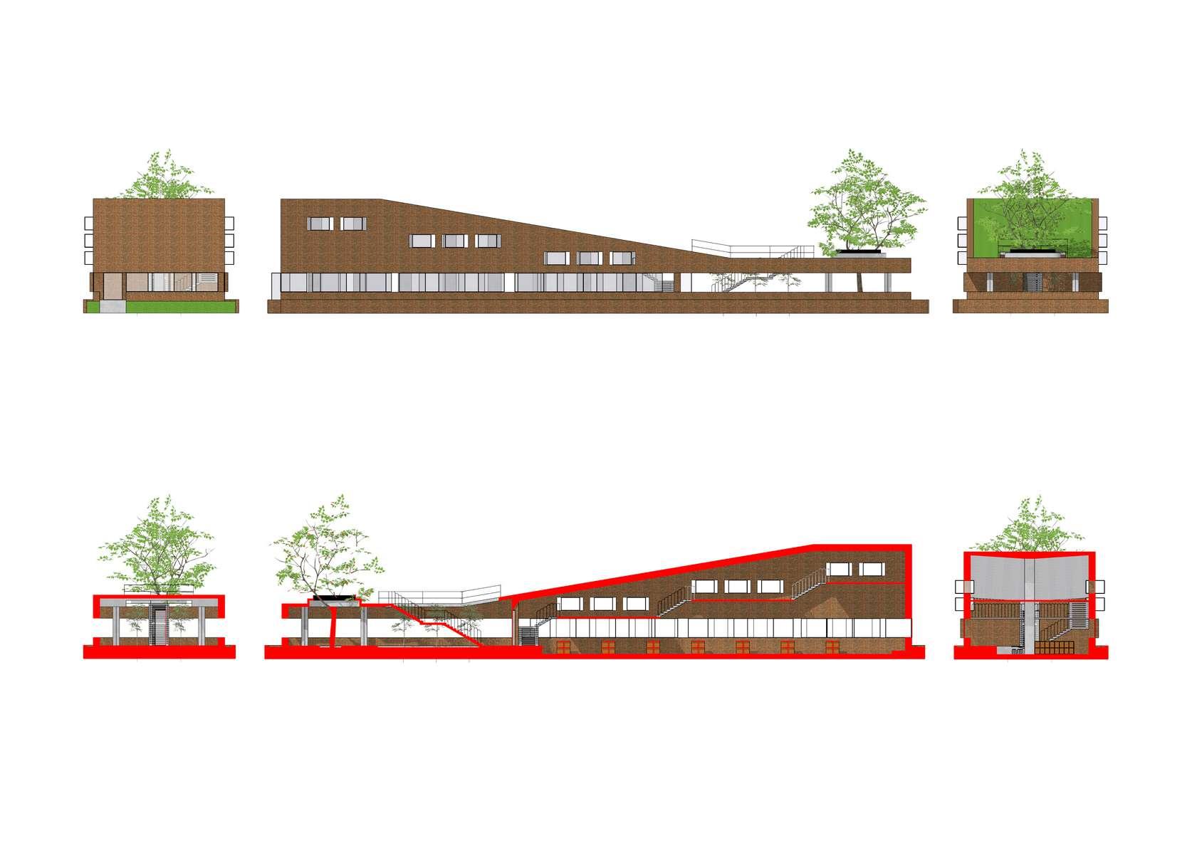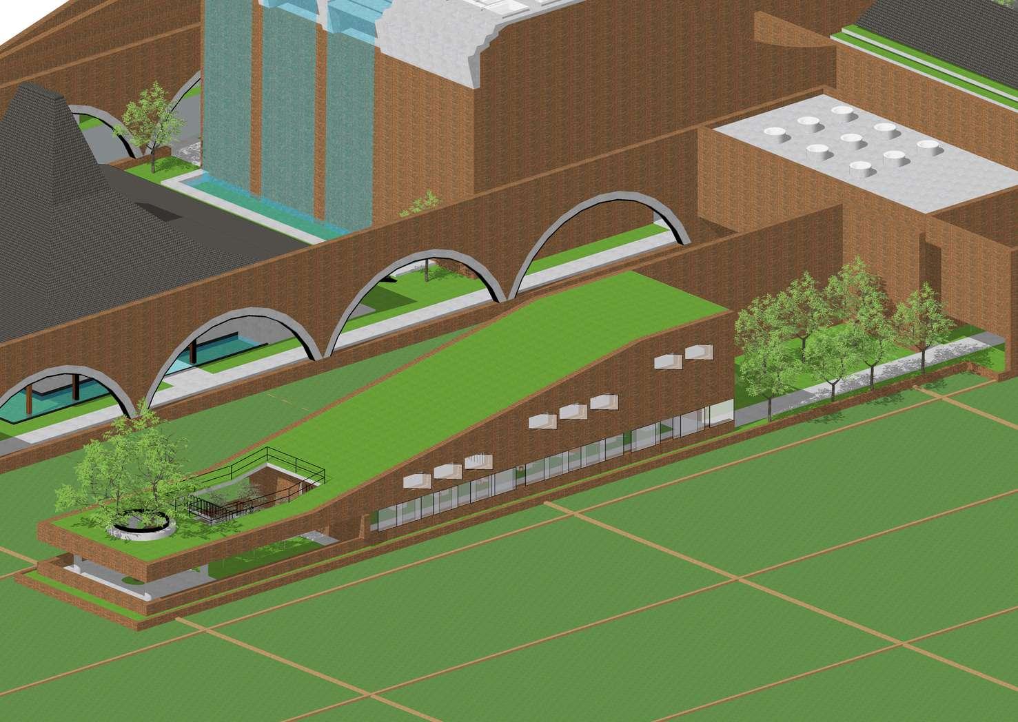 Seteah meaui auditorium, pengunung akan menemui lingkungan amphiteater D dalamnya termasuk blok bangunan yang terpadu yaitu amphteater, gaer sen rupa, dan workshop kesenian Terhubung dengan gedung literasi mealui koridor Sedangkan gedung iterasi merupakan bangunan di tengah area persawahan Di dalamnya termasuk ruang perpustakaan, koleksi, dan dorama. memiik fitur atap hijau yang bisa dakses pengunjung. Kedua blok bangunan ini dlengkapi fasiltas perbadatan berupa mushalla