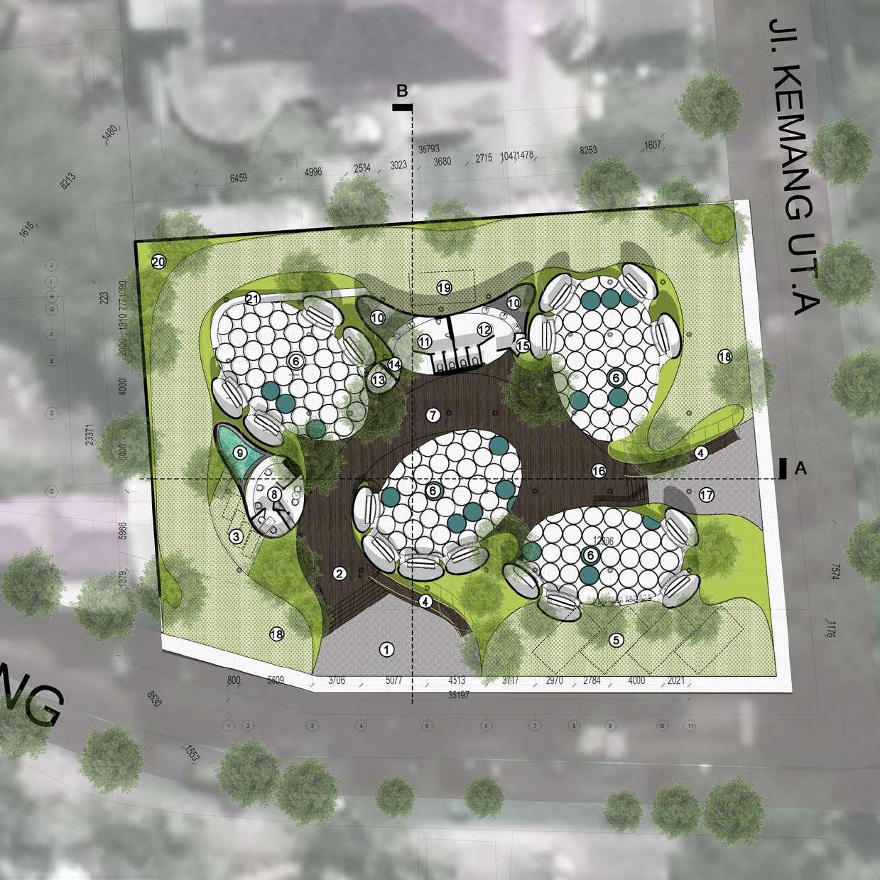 Peletakan zona dan bangunan mengoptimalkan pemandangan sungai dan persawahan di timur dan persawahan di barat. Sedangkan Volume bangunan di desain untuk kenyaman termal dengan merekayasa sinar matahari melalui strategi pembayangan.