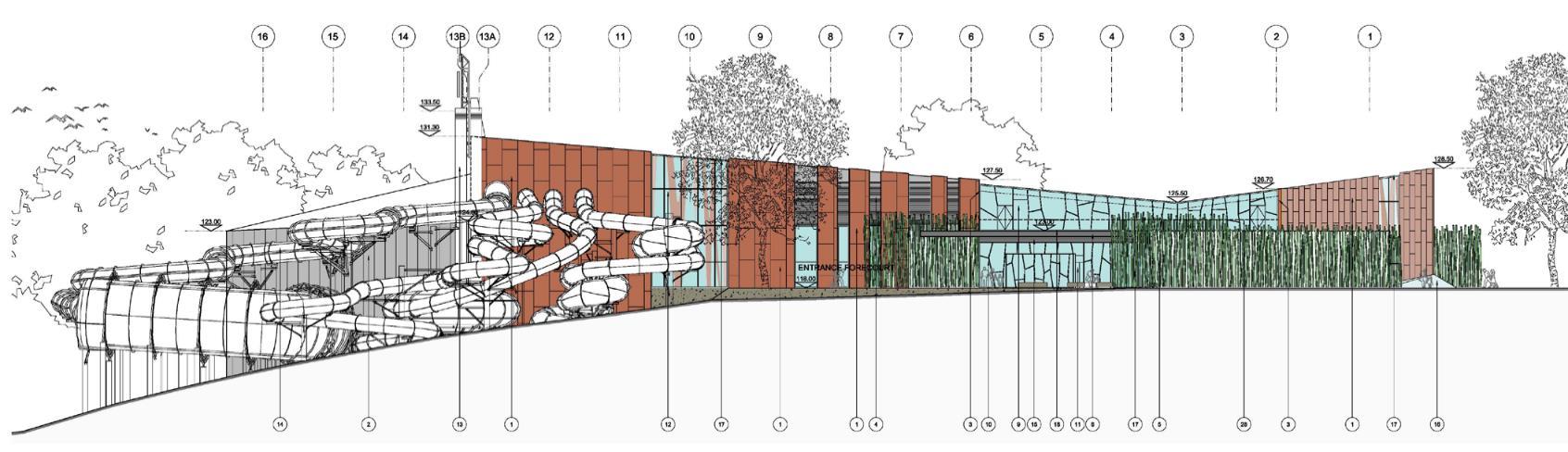 A £17m themed water park building in West Midlands Safari Park linked to a hospitality development. With references to nature and the African culture, the building volume increases and decreases responding to internal spatial requirements for high waterslides or low kids puddling zones I developed the design from concept to planning submission and I was responsible for the coordination of information from the design team, specialist consultants and thematic designers