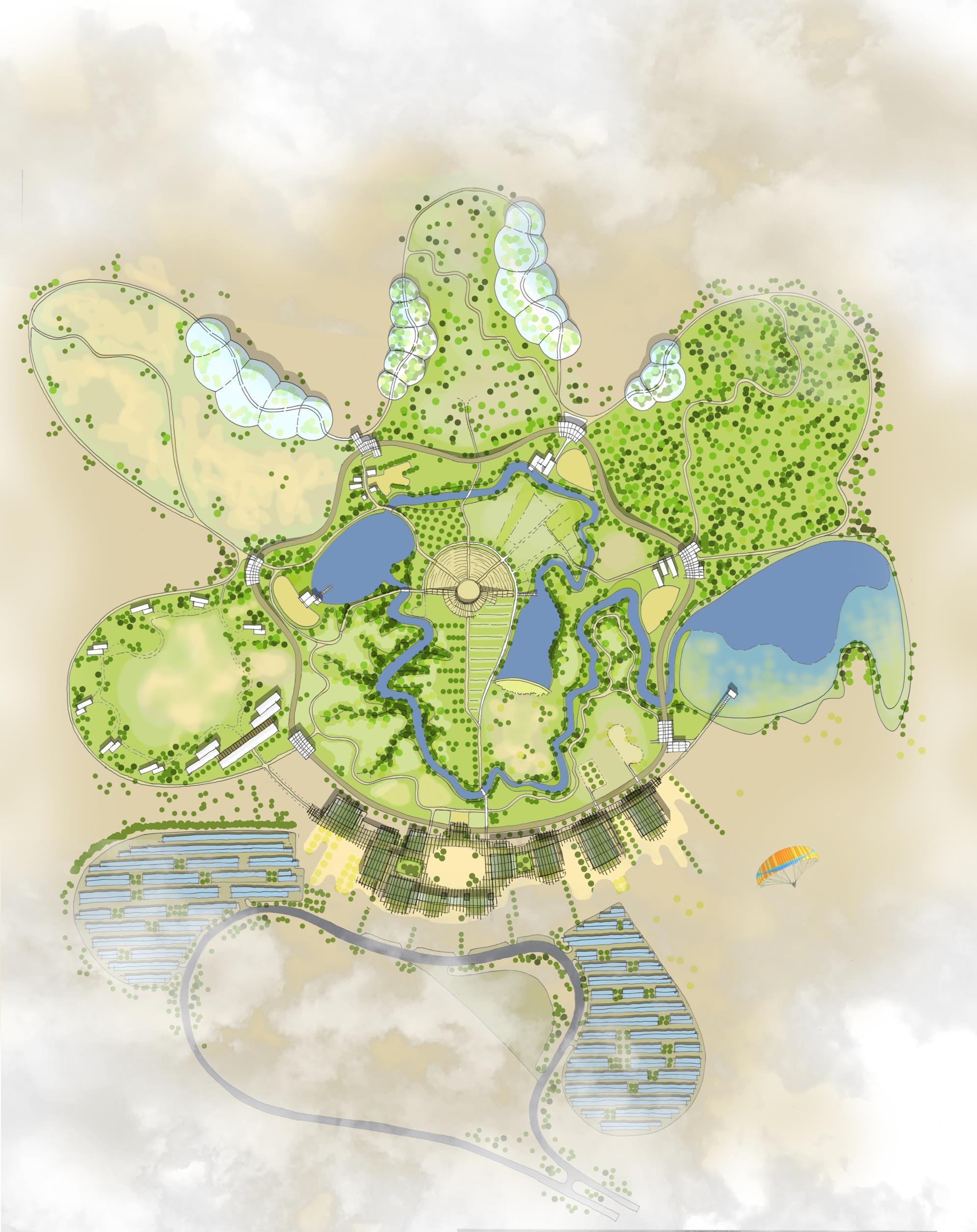 An environmental complex and nature themed resort, an international destination, a regenerative development will boost economic growth and sustainable tourism, education and research, heritage and local tradition Similarly to the Eden Project the scheme will feature bio clusters and greenhouses, a science and research park, adventure and nature thematic gardens as well as well being facilities. Dominated by nature and landscape the scheme will form a centre for the environment of international excellence