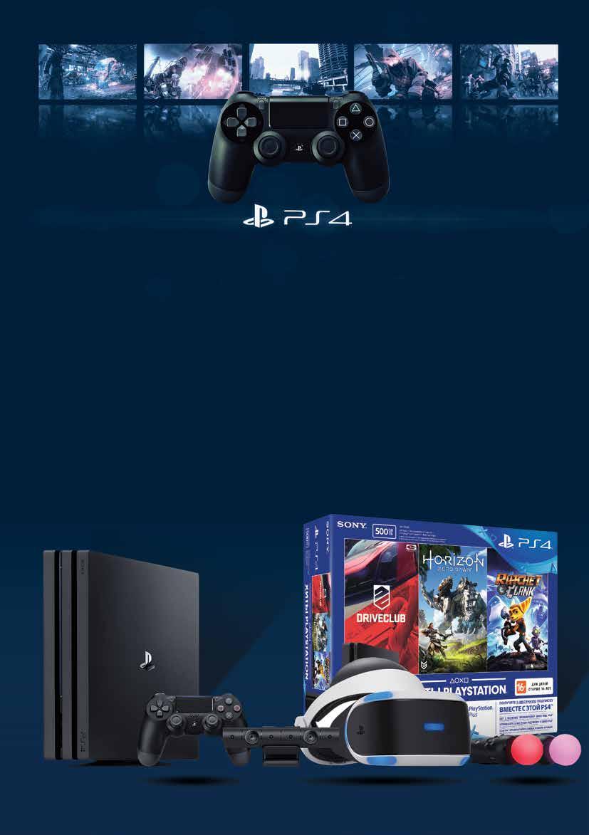 Особливу увагу слід звернути на унікальну пропозицію: комплект з PlayStation 4, трьох різнопланових ігор (Driveclub, Ratchet & Clank, Horizon Zero Dawn) та передплати на сервіс PlayStation Plus на три місяці.