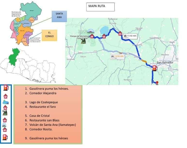 En el presente trabajo presentamos nuestra propuesta de ruta turística que tienen recorrido de 2 municipios de Santa Ana Hemos realizado una extensión de investigación sobre los distintos municipios a su vez hemos hecho en foda que nos dará mayor comprensión sobre la ruta turística y los municipios donde se realizará la ruta y las distintas actividades Para tener una mejor comprensión de la distancia de cada municipio cuánto tiempo tardaría el recorrido por cada uno de los lugares turísticos que se visitará Dentro del trabajo se menciona todos los canales de distribución tanto como alimentación transporte clientes objetivos horarios ruta turística y nuestro público objetivo