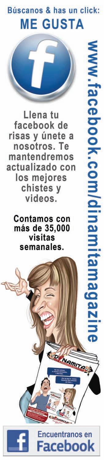 El contenido de Dinamita no refleja el pensamiento de sus creadores. Dinamita no se hace responsable del contenido de los artículos, ni avisos publicados por los clientes, ni productos defectuosos, ni malos servicios ofrecidos por los publicantes. Todos los gráficos y diseños son exclusividad de Dinamita publications & GraphiCR LLC, su uso total o parcial es prohibido. Los artistas conservan los derechos sobre sus obras.