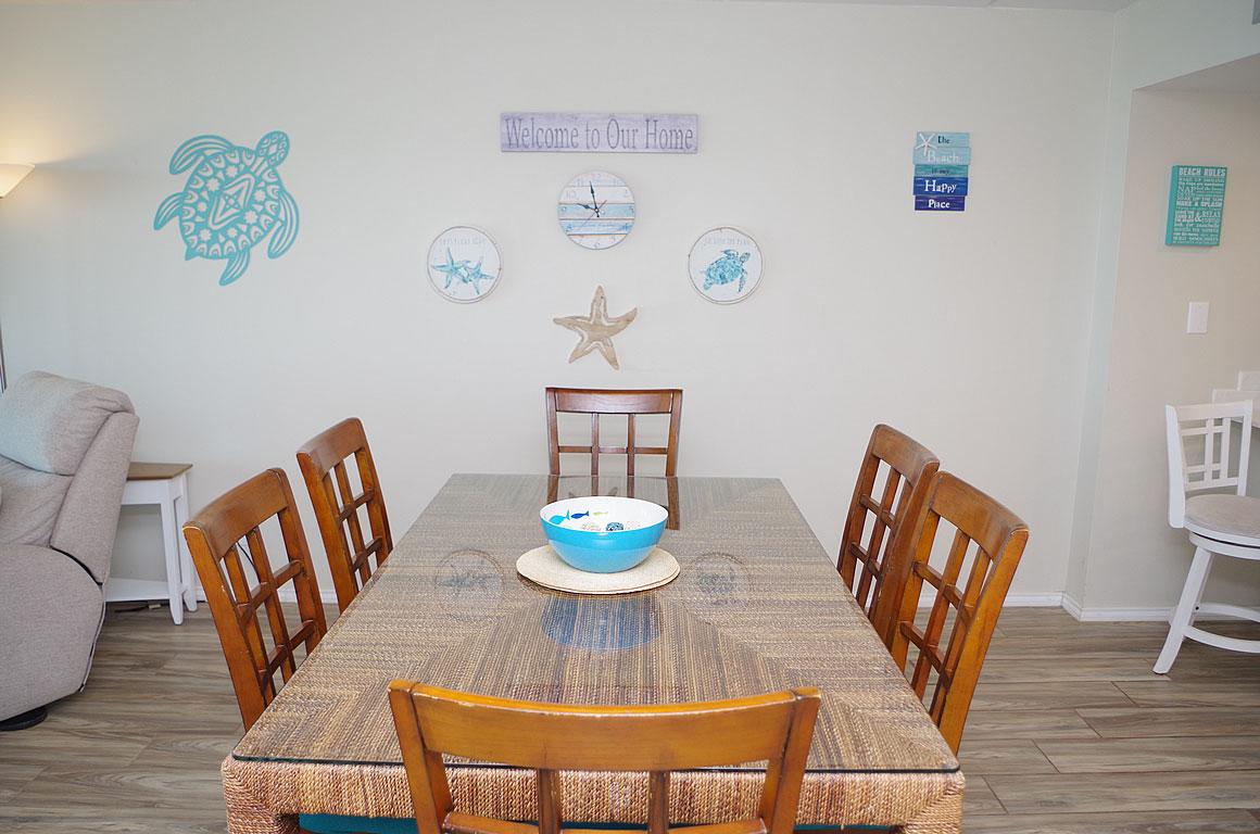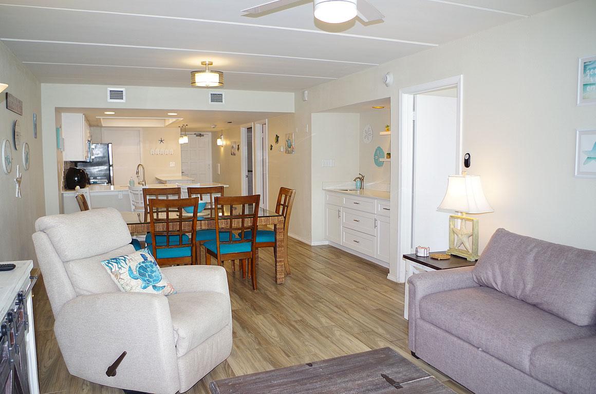 Welcome to your coastal sanctuary! Step into luxury with a fully updated interior featuring a modern kitchen & baths, & gorgeous finishes. Plank tile flooring adds elegance & durability to the living spaces, where ocean views greet you from the floor-to-ceiling windows. Whether you're enjoying your morning coffee on the private balcony or entertaining guests in the open concept living/dining area, the ocean serves as the perfect backdrop for every occasion. There is large utility room, thoughtfully designed w/ cabinets & shelves alongside a full-size washer/dryer. Selling fully furnished and completely remodeled, there is nothing left to do except to start enjoying the island lifestyle. Suntide III amenities include outdoor pool, INDOOR POOL, tennis, multi-sport court, sauna, gated entry, covered parking, BBQ area, 24hr front desk, & walkway to beach. Don't let this opportunity slip away — schedule your viewing today and discover beachfront luxury living!