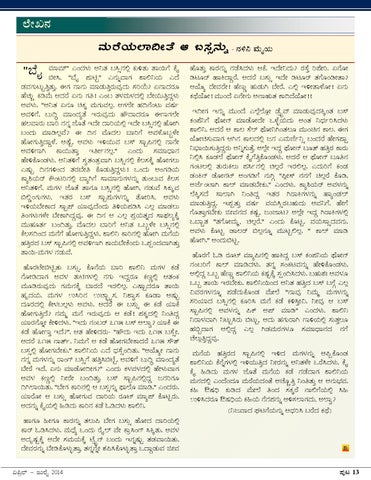 <ಾc" ಎಂದಳ ಅ1ತ ಬSfನ ಕುGತು Yಾg4ೆ Oೈ hೕS. "bೈ ಪು(3" ಎನು /ಾಗ _ಾ 1ಯ ಎ ೆ ಡವಗುಟು3$'ತು'. ಈಗ Dಾನು <ಾಡು$'ರುವTದು ಸEi? ಏDಾದರೂ Wೆಚುk ಕ`8 ಆದ ೆ ಏನು ಗ$! ಎಂಬ ತಳಮಳದ bೇಯು$'ದmಳ ಅವಳ . "ಅ1ತ ಏನೂ ಕX ಮಗುವಲ . ಆಗ;ೇ ಹ Dೆಂಟು ವಷ7 ಅವG4ೆ. ಬು n <ಾಂದ!Yೆ ಇರುವTದು Wೌ ಾದರೂ ಈ4ಾಗ;ೇ ಹಲ/ಾರು bಾE ನನ qೊYೆ ಇ ೇ ಾEಯ ಇ ೇ ಬSfನ WೋF ಬಂದು <ಾ`ಲ /ೆ? ಈ ನ rದಲ bಾE4ೆ ಅವsೆtಬusೇ Wೋಗು$' ಾmsೆ. ಅvೆ3. ಅವಳ ಇGಯುವ ಬw ,ಾ3xನ DಾDೇ ಅವG4ಾF OಾಯುYಾ' ಇ$ೕ7ನಲ ." ಎಂದು ಸ<ಾyಾನ WೇGOೊಂಡಳ . ಅ1ತG4ೆ ಸ-ತಂತ /ಾF ಬSfನ OೆಲಸOೆX Wೋಗಲು ಎಷು3 ನಗGಂದ ತರbೇ$ Oೊಡು$'ದmಳ ! ಒಂದು ಅಂಗ`ಯ Oಾ!"ಯ{ OೌಂಟEನ bಾ!F4ೆ ,ಾ<ಾನುಗಳನು ತುಂಬುವ Oೆಲಸ ಅ1ತG4ೆ. ಮಗಳ qೊYೆ Yಾನೂ ಬSfನ WೋF, ನಡು/ೆ SಕುXವ h |ಂಗುಗಳ , ಇತರ ಬw ,ಾ3ಪುಗಳನು YೋES, ಅವಳ ಇGಯbೇOಾದ ,ಾ3} ~ಾವT ೆಂದು $Gಯಪ`S ಎಲ <ಾಡಲು $ಂಗಳ ಗsೇ bೇOಾFದmವT. ಈ ನ ಆ ಎಲ ಪ ಯತ ದ ,ಾಫಲ!OೆX ಮುಹೂತ7 ಬಂ ತು'. rದಲ bಾE4ೆ ಅ1ತ ಒಬusೇ ಬSfನ