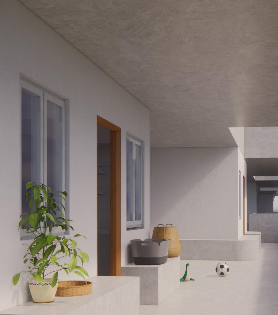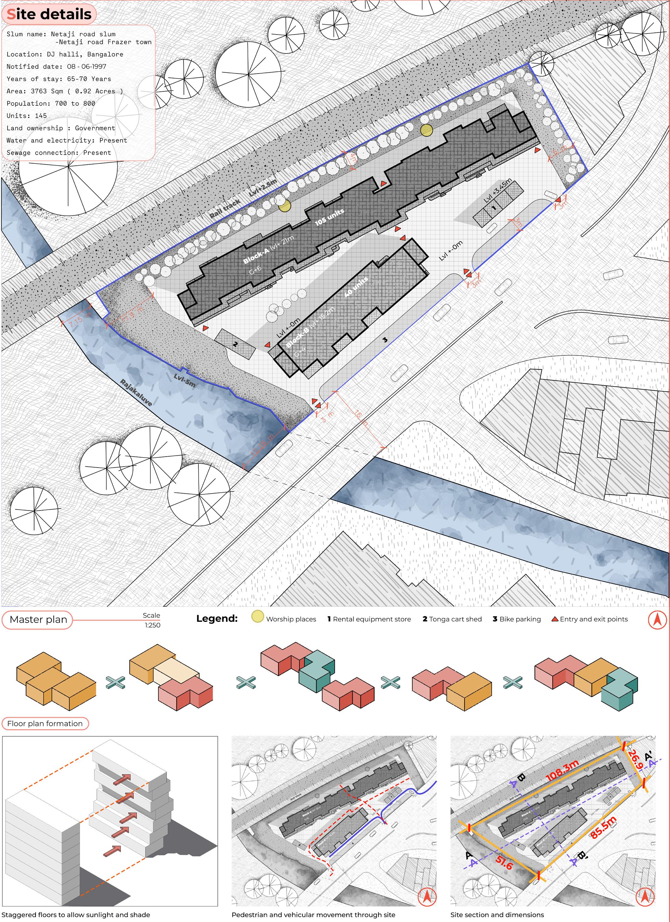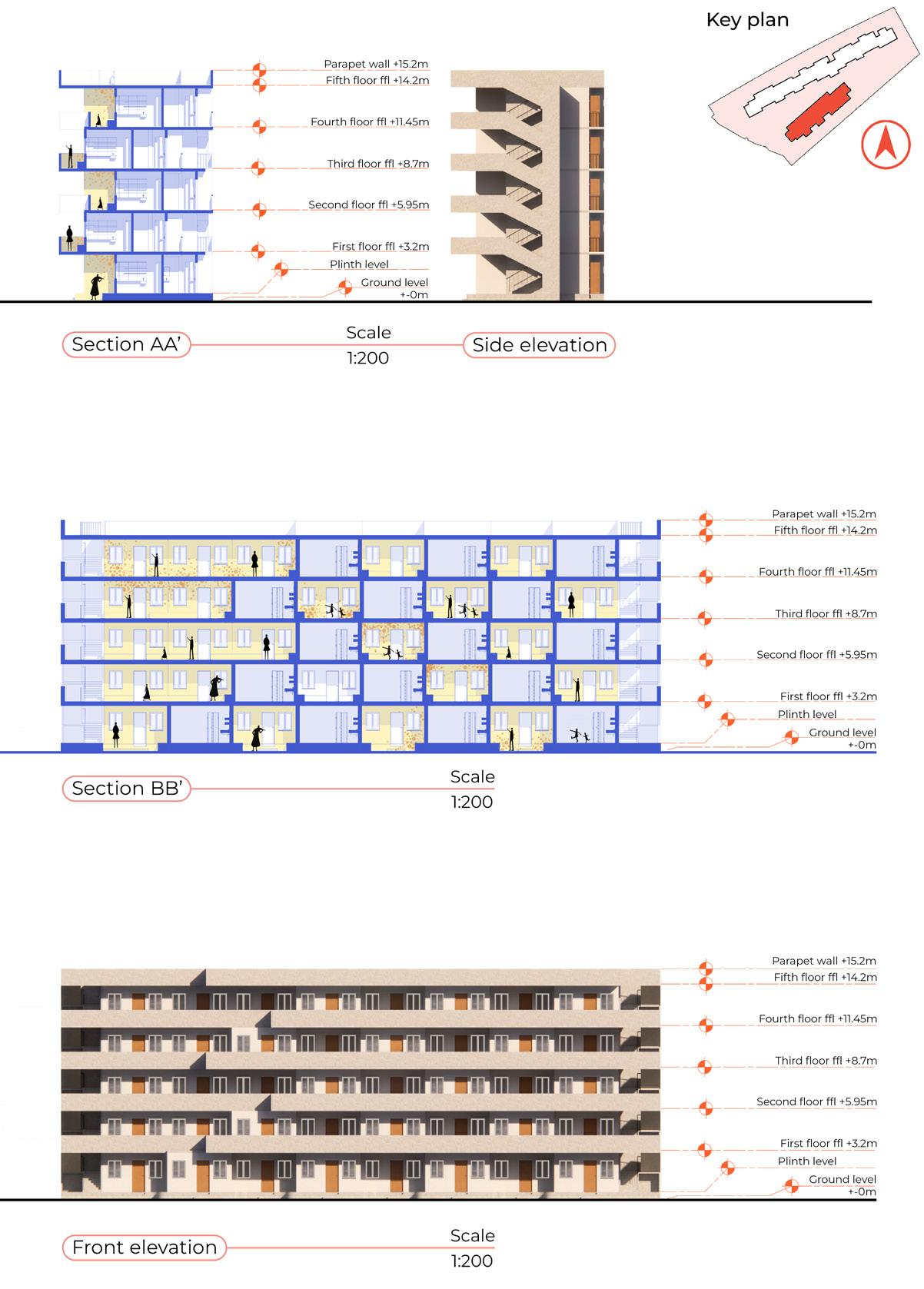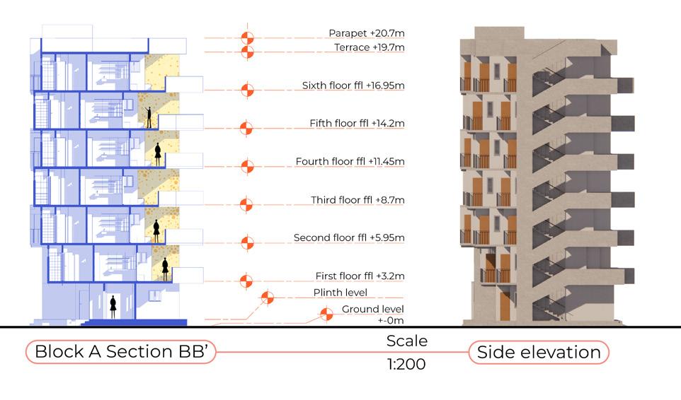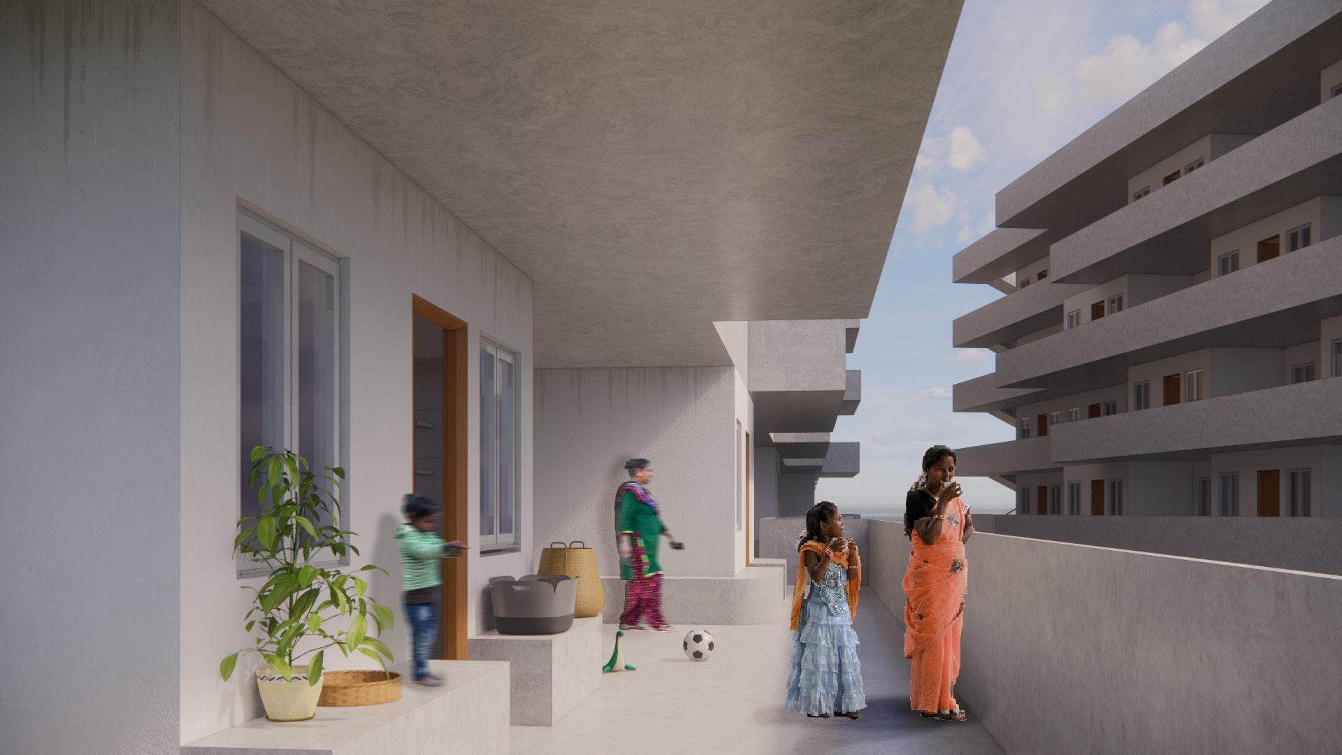 The design integrates modular precast units for efficient and rapid construction. Given the limited site area, the focus is on creating community gathering spaces on each level of the structure, rather than just at ground level. The staggered arrangement of the units generates small communal areas on each floor, allowing residents to engage with their neighbors, mirroring the closeknit social life of slum communities