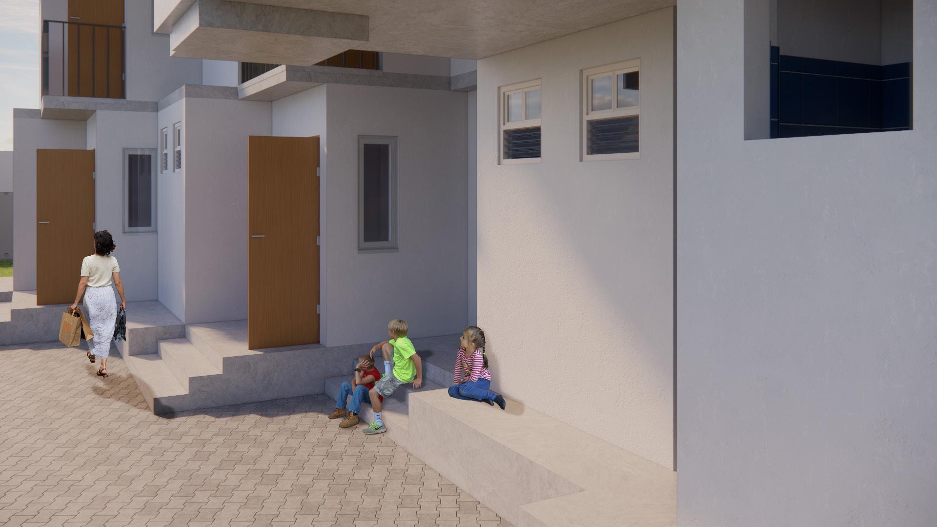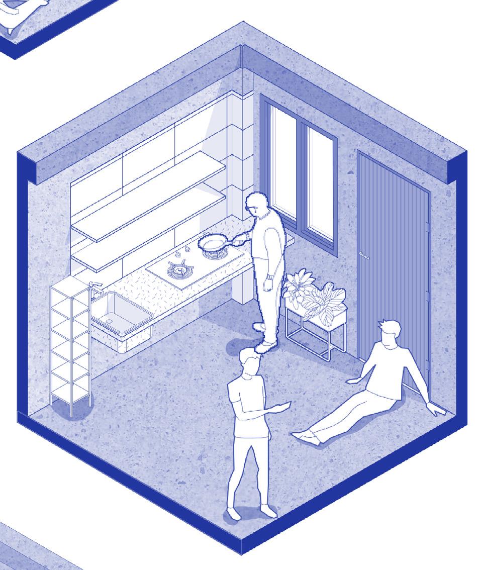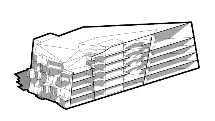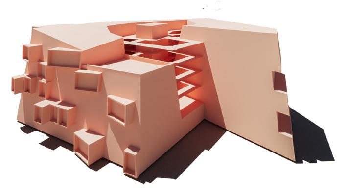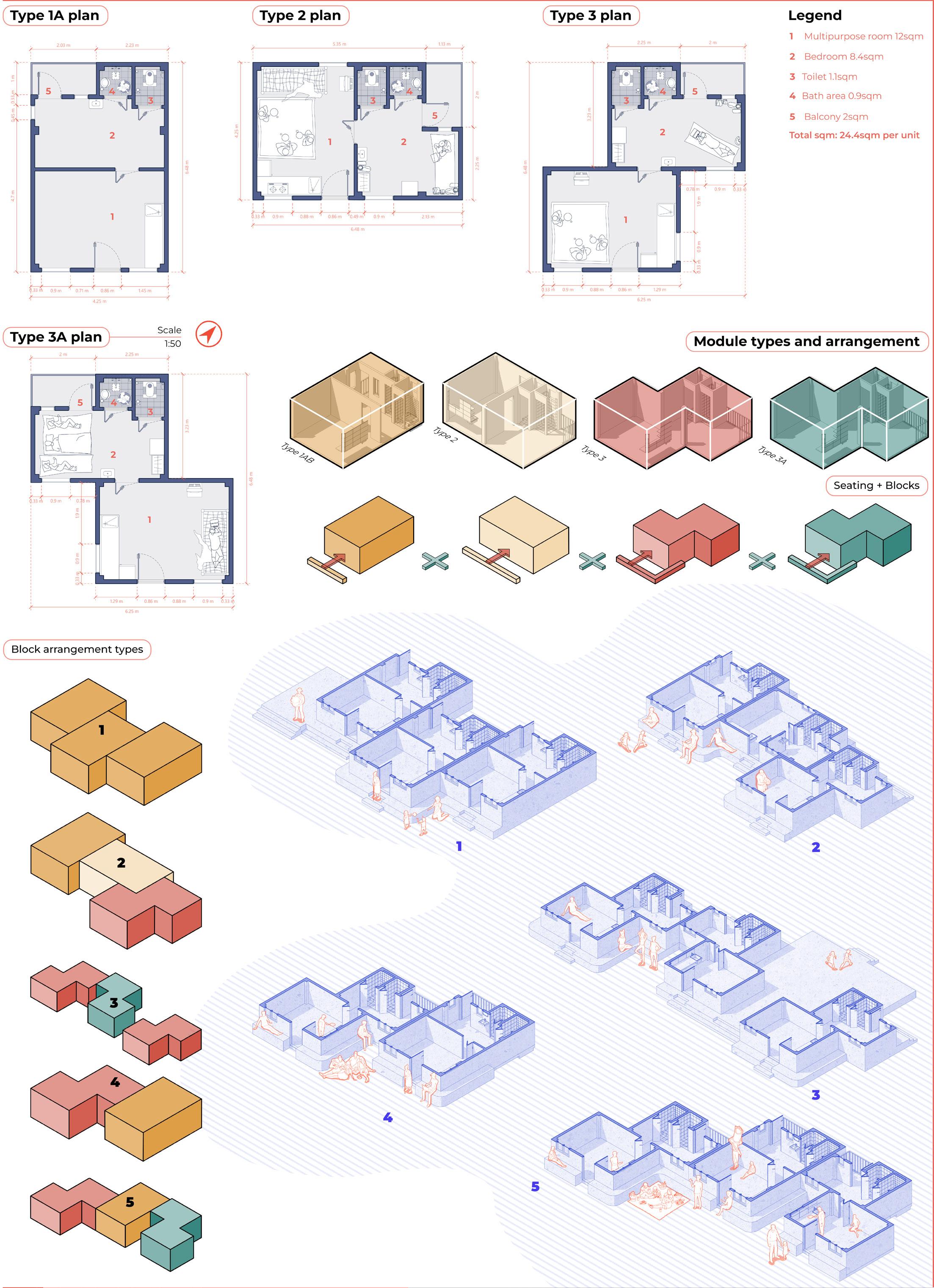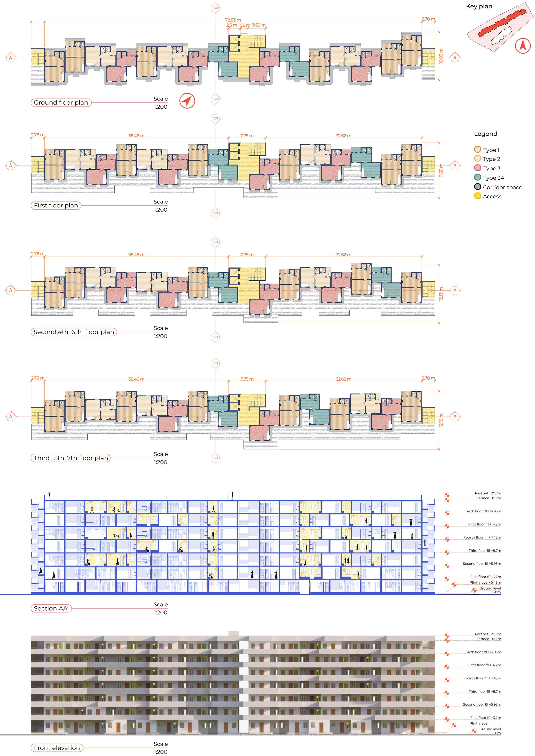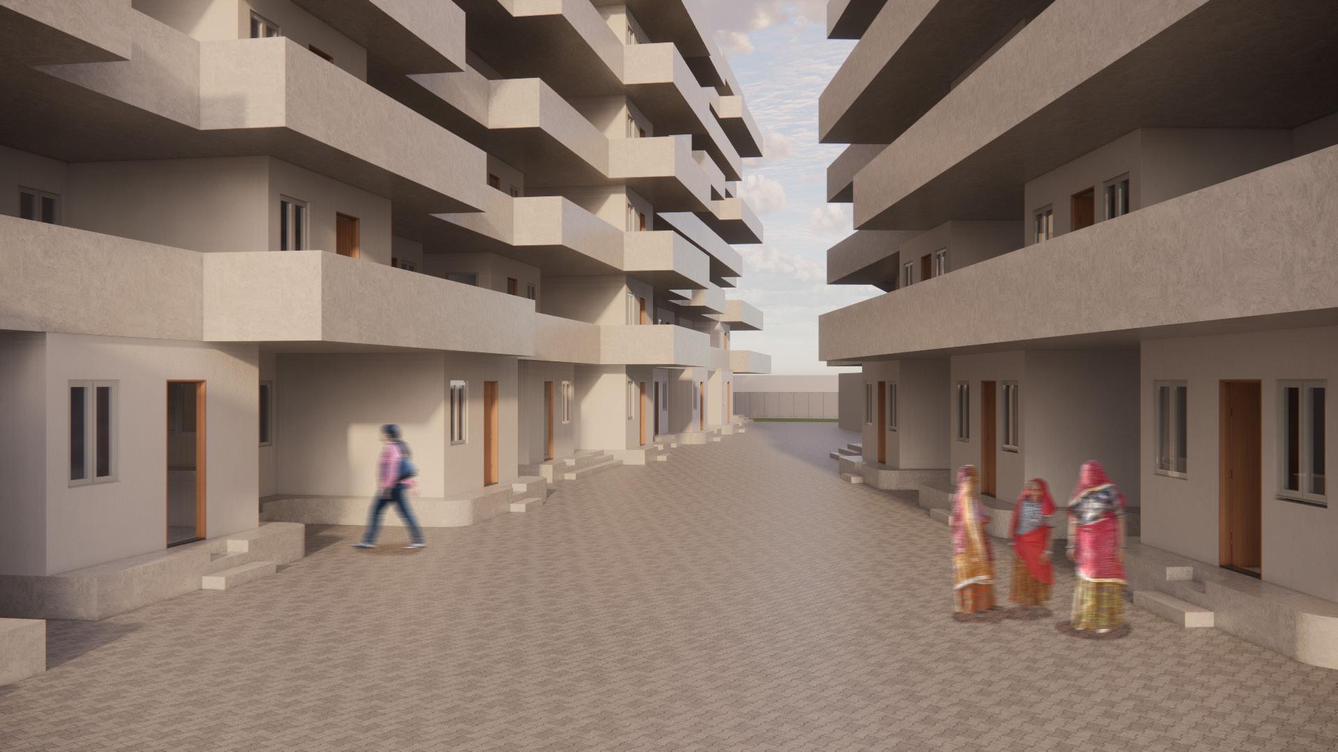 The design integrates modular precast units for efficient and rapid construction. Given the limited site area, the focus is on creating community gathering spaces on each level of the structure, rather than just at ground level. The staggered arrangement of the units generates small communal areas on each floor, allowing residents to engage with their neighbors, mirroring the closeknit social life of slum communities
