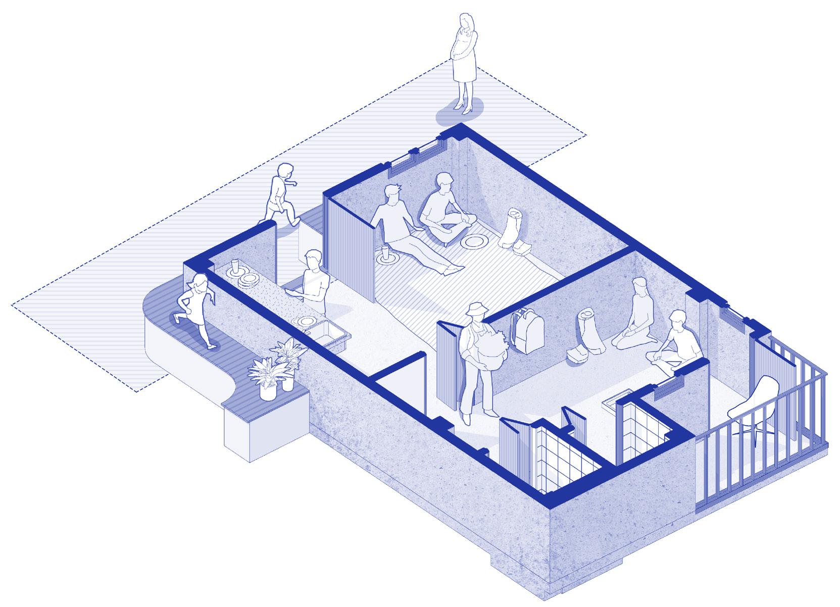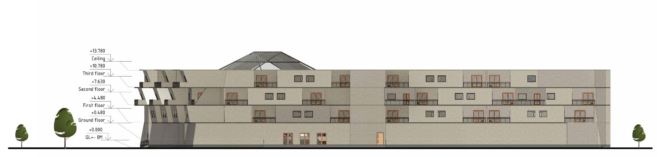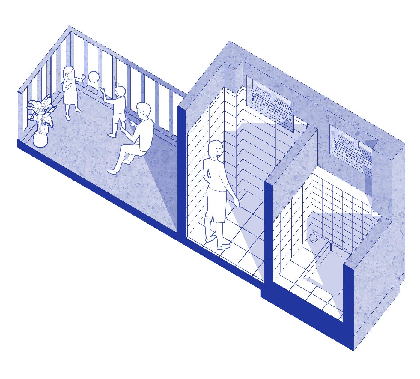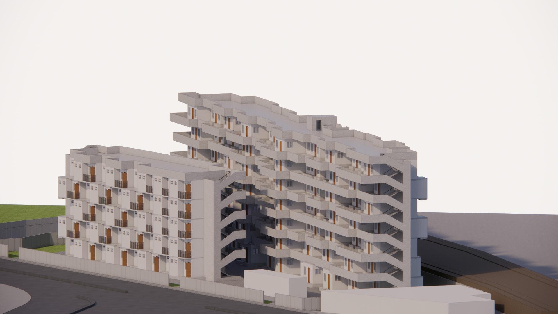The design integrates modular precast units for efficient and rapid construction. Given the limited site area, the focus is on creating community gathering spaces on each level of the structure, rather than just at ground level. The staggered arrangement of the units generates small communal areas on each floor, allowing residents to engage with their neighbors, mirroring the closeknit social life of slum communities