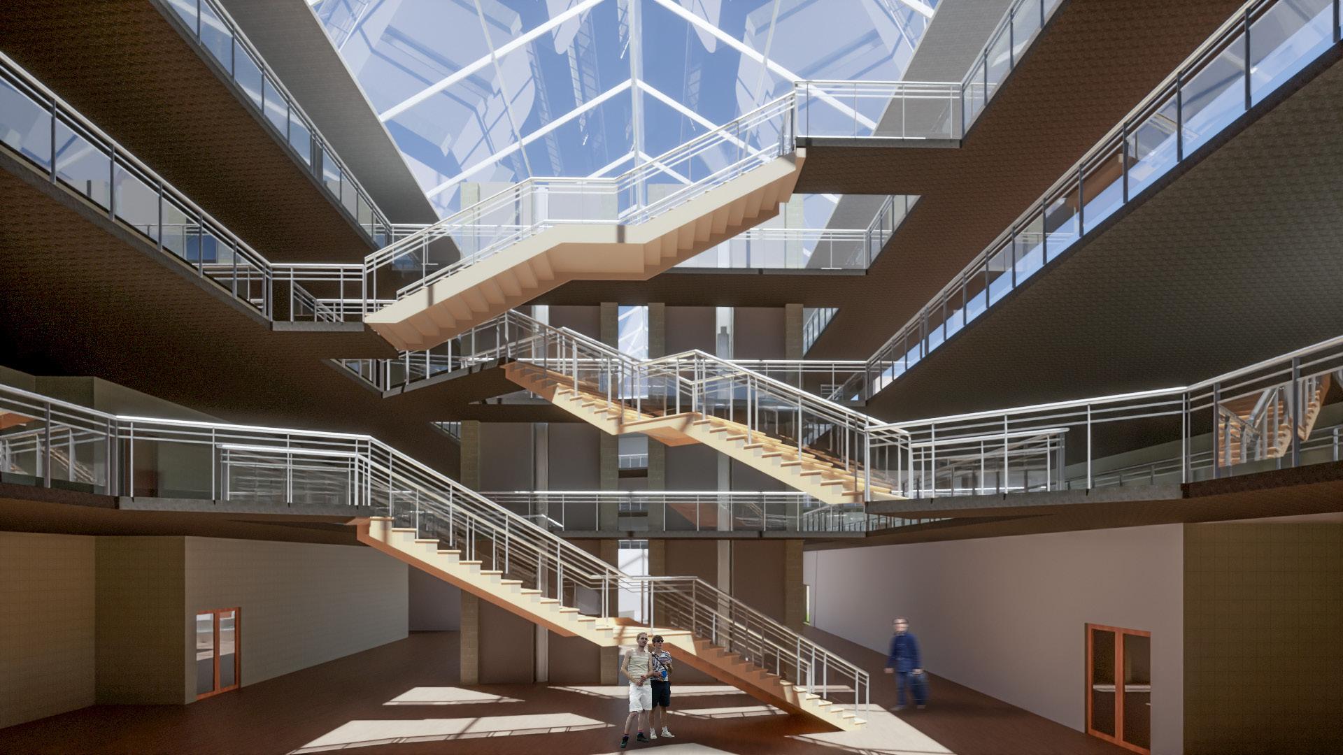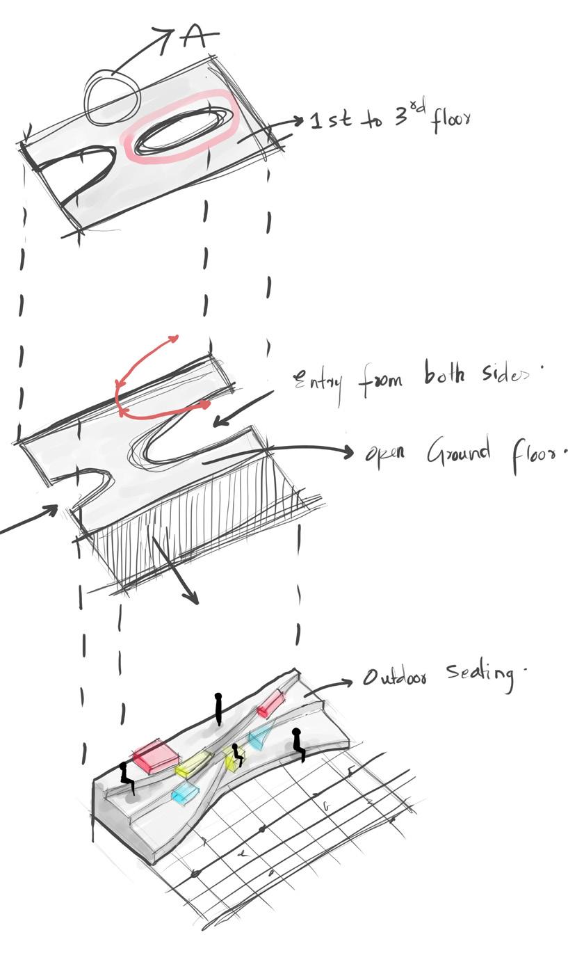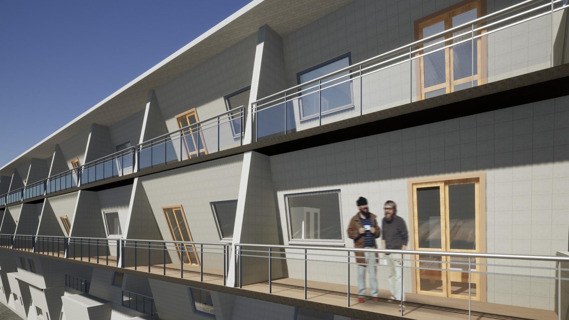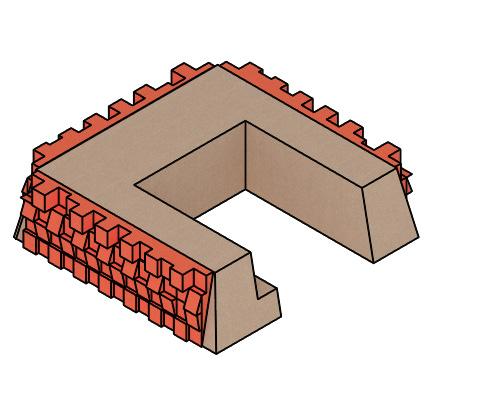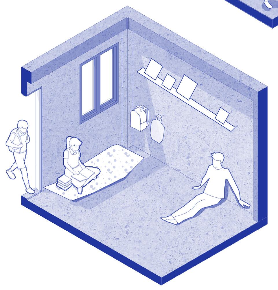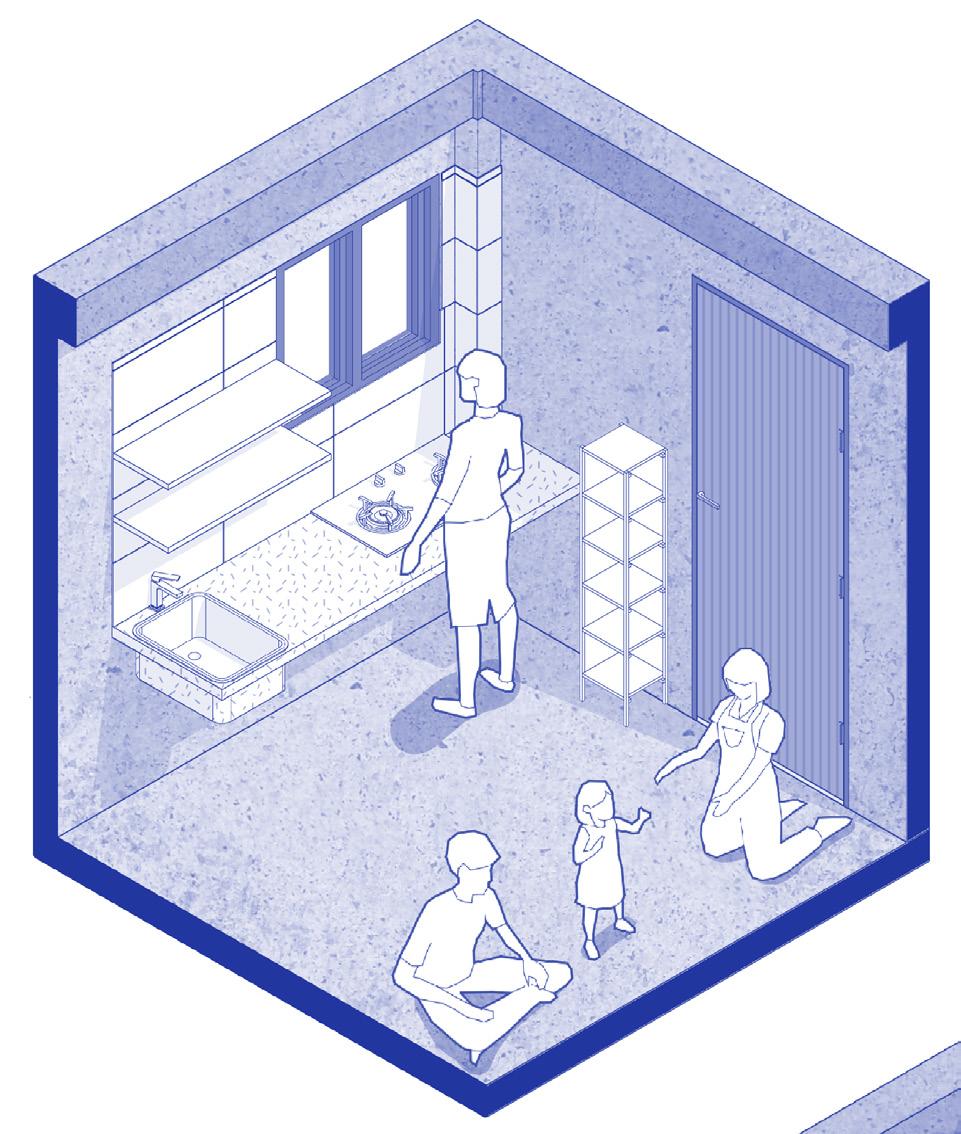 The design integrates modular precast units for efficient and rapid construction. Given the limited site area, the focus is on creating community gathering spaces on each level of the structure, rather than just at ground level. The staggered arrangement of the units generates small communal areas on each floor, allowing residents to engage with their neighbors, mirroring the closeknit social life of slum communities