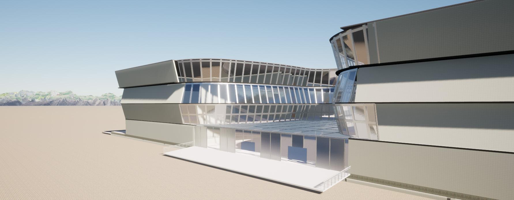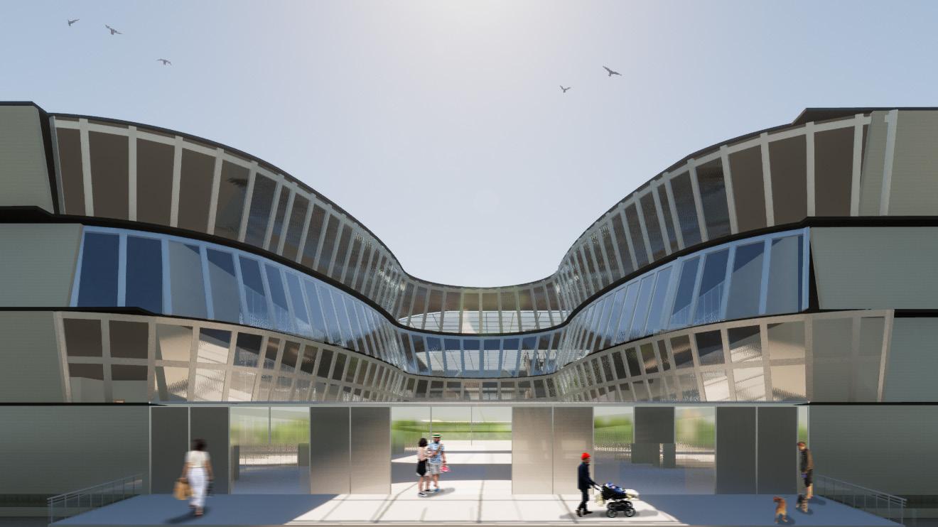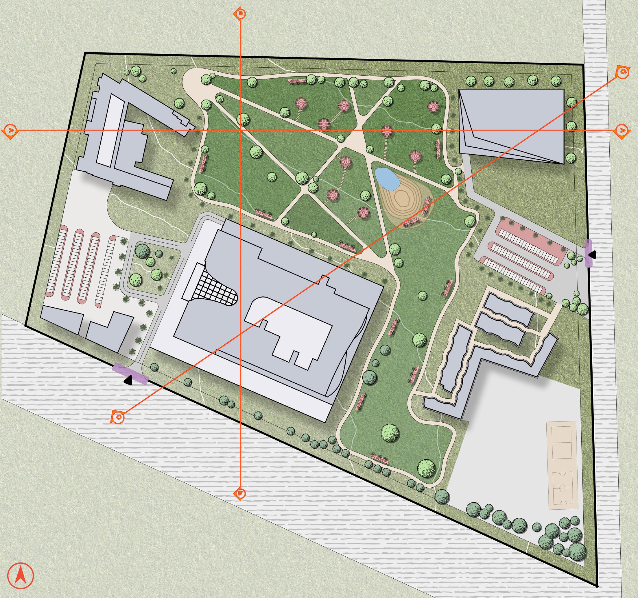 This development features a hotel, a mall, apartments, and office spaces, with a focus on playfulness achieved through a deconstructivist architectural style. The design includes parks, jogging tracks, and a pond, with the pathways laid out in a non-linear, dynamic manner to create a more organic feel. Trees are strategically placed, using different species to achieve varied effects