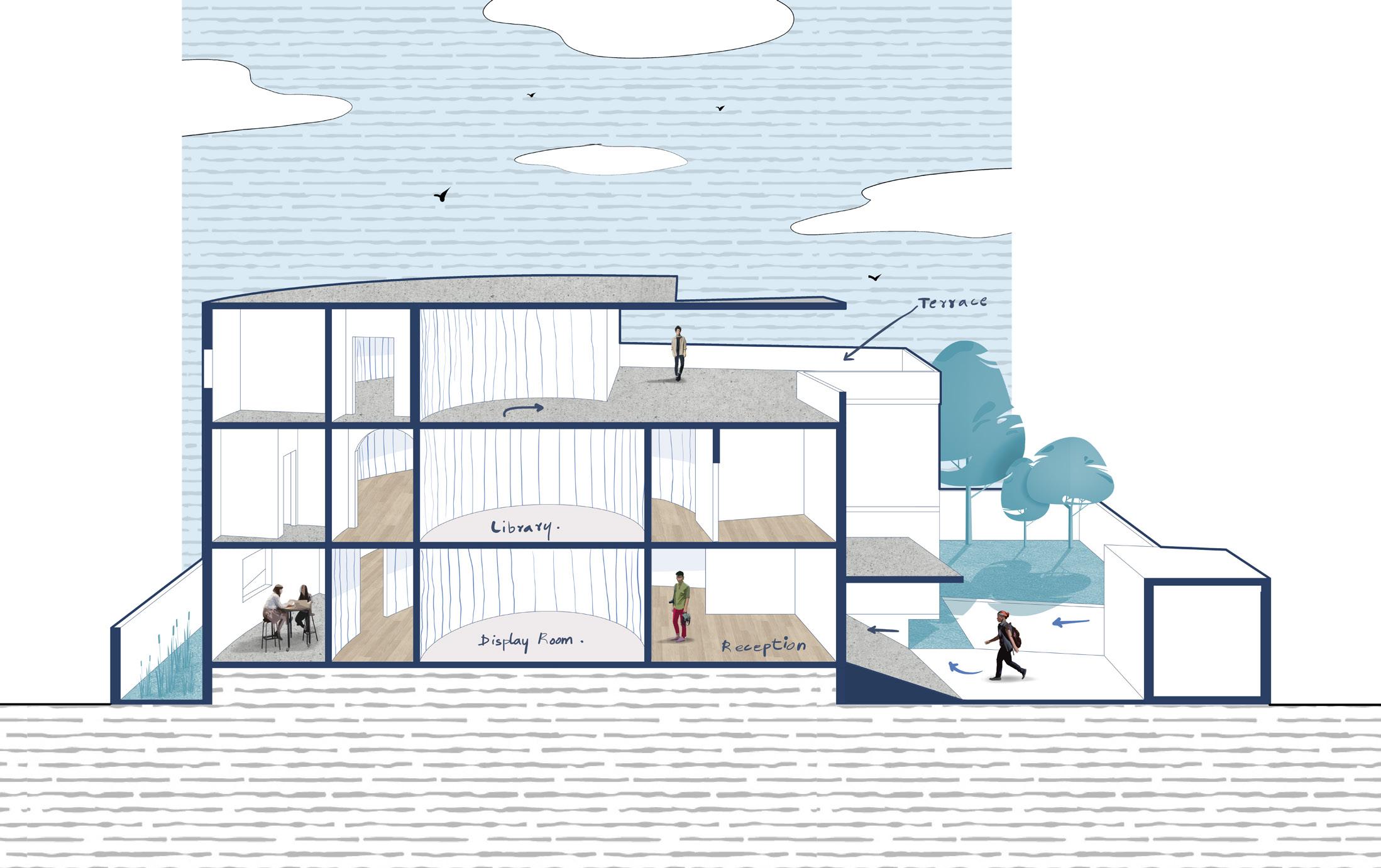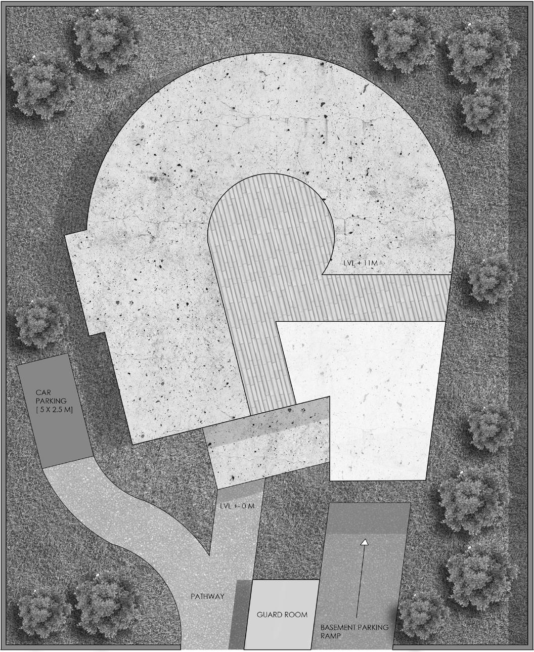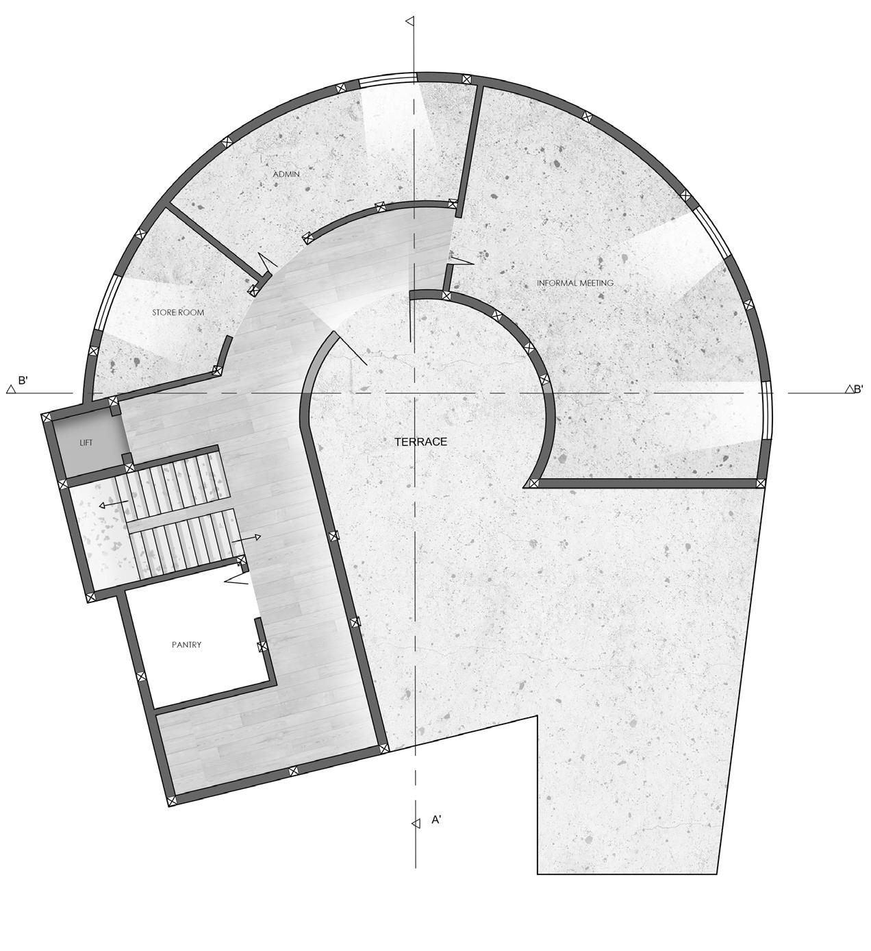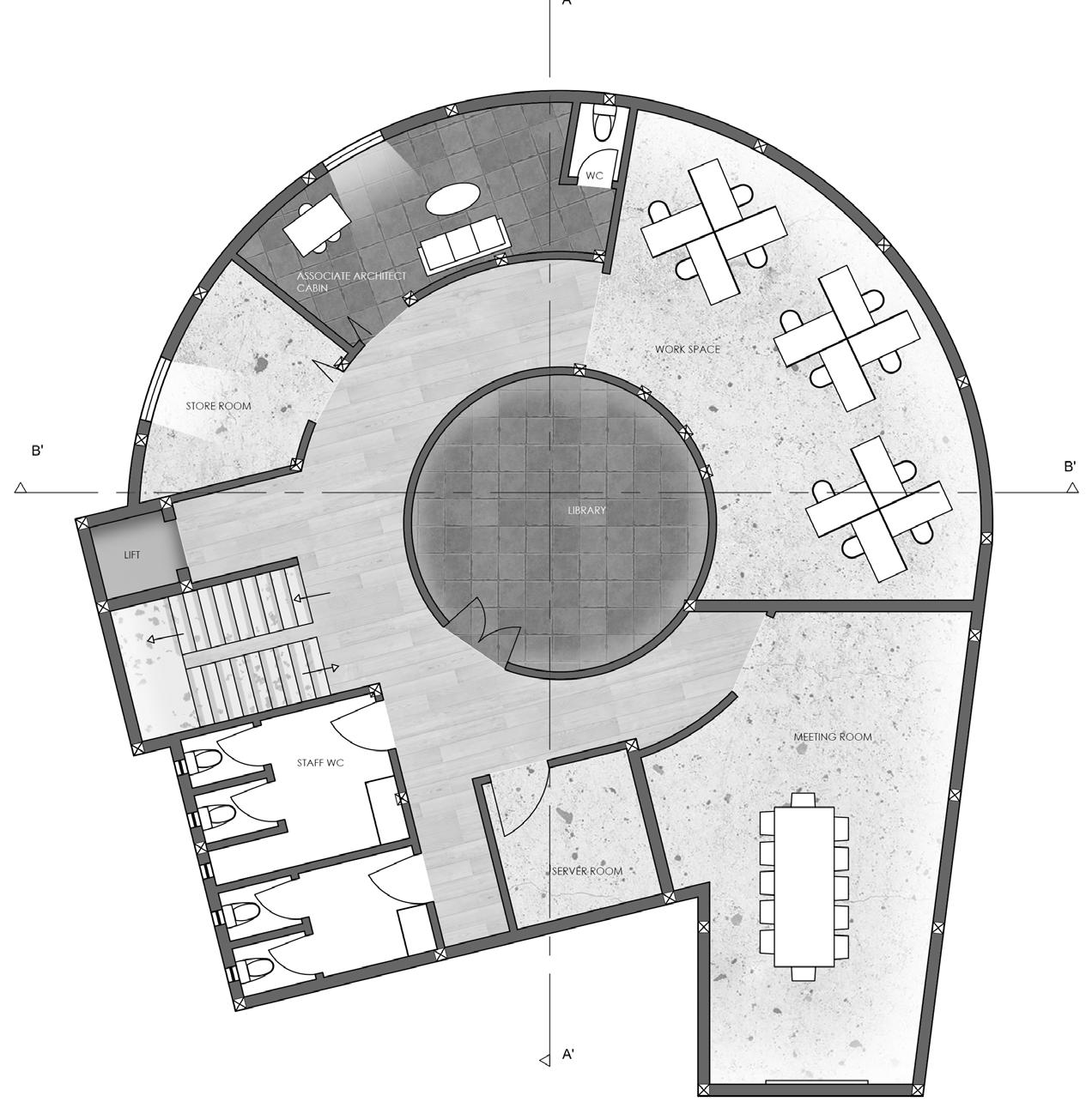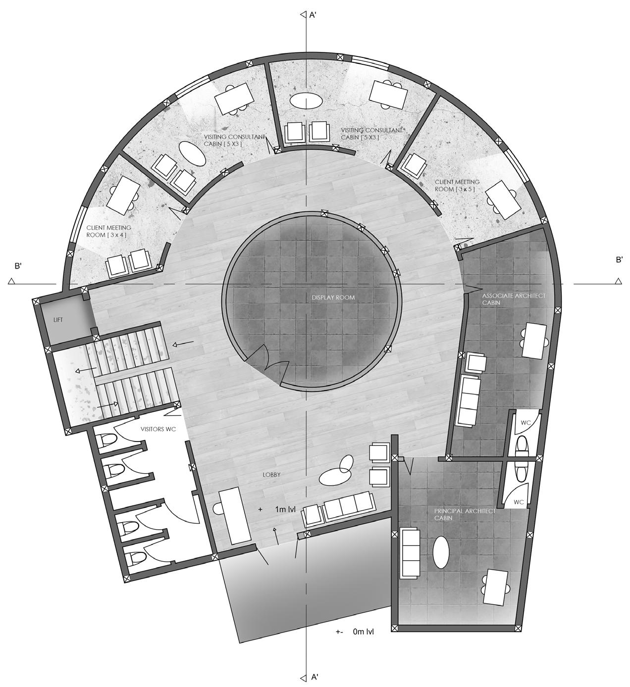 Inspired by Ar. Laurie Baker’s principles, the design incorporates elements like filler slabs, jali walls, and brickwork, reflecting his commitment to costeffective construction and harmony with nature. The design features curvilinear forms and extensive use of bricks, allowing the office to blend seamlessly with nature, reflecting his signature style.