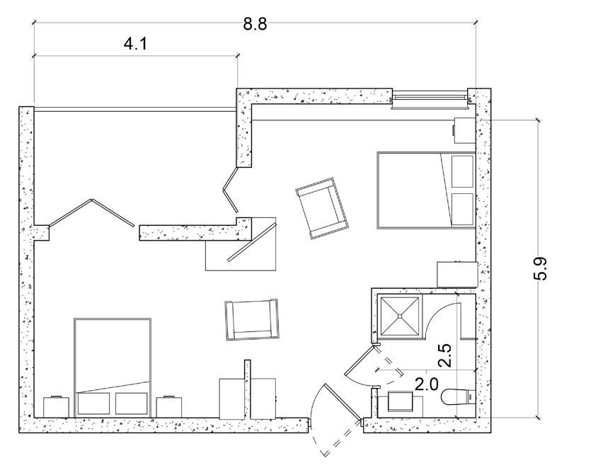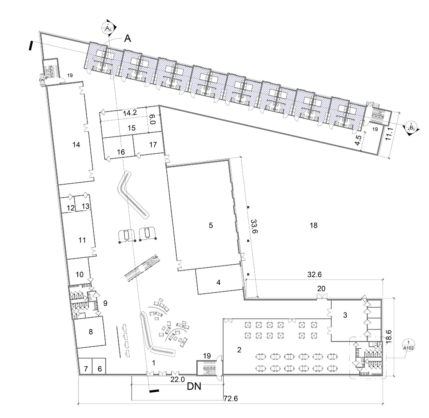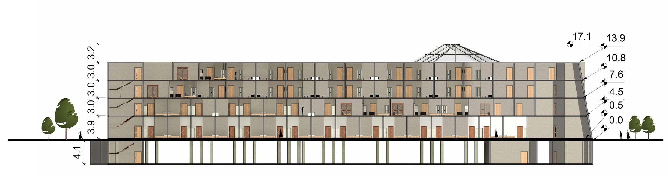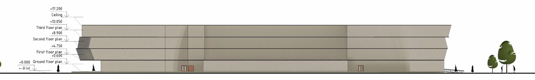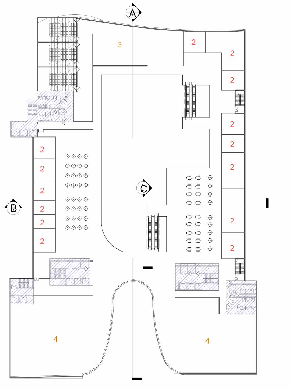 Inspired by Ar. Laurie Baker’s principles, the design incorporates elements like filler slabs, jali walls, and brickwork, reflecting his commitment to costeffective construction and harmony with nature. The design features curvilinear forms and extensive use of bricks, allowing the office to blend seamlessly with nature, reflecting his signature style.