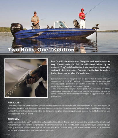 Two Hulls, One Tradition Lund’s hulls are made from fiberglass and aluminum—two very different materials. But our hulls aren’t defined by raw material. They’re defined by tradition, quality craftsmanship and meticulous standards. Because how the boat is made is just as important as what it’s made from. Both our aluminum and fiberglass hulls are derived from the same innovative design—Lund’s IPS™, IPS™2 and IPS™3 (Integrated Power Strake) technology. We’ve developed a construction process that incorporates the same industryleading design into every hull that comes off the line. Our aluminum and fiberglass hulls expand your possibilities and offer a customizable experience. We take pride knowing that whatever material you choose—whether it’s the smooth and sleek fiberglass or rugged aluminum—you’re still in a Lund.