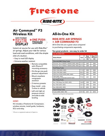 #2581 Kit includes a Firestone Air Compressor, wireless remote, install guide, hardware, ECU and relay. *iPhone is a registered trademark of Apple Inc.