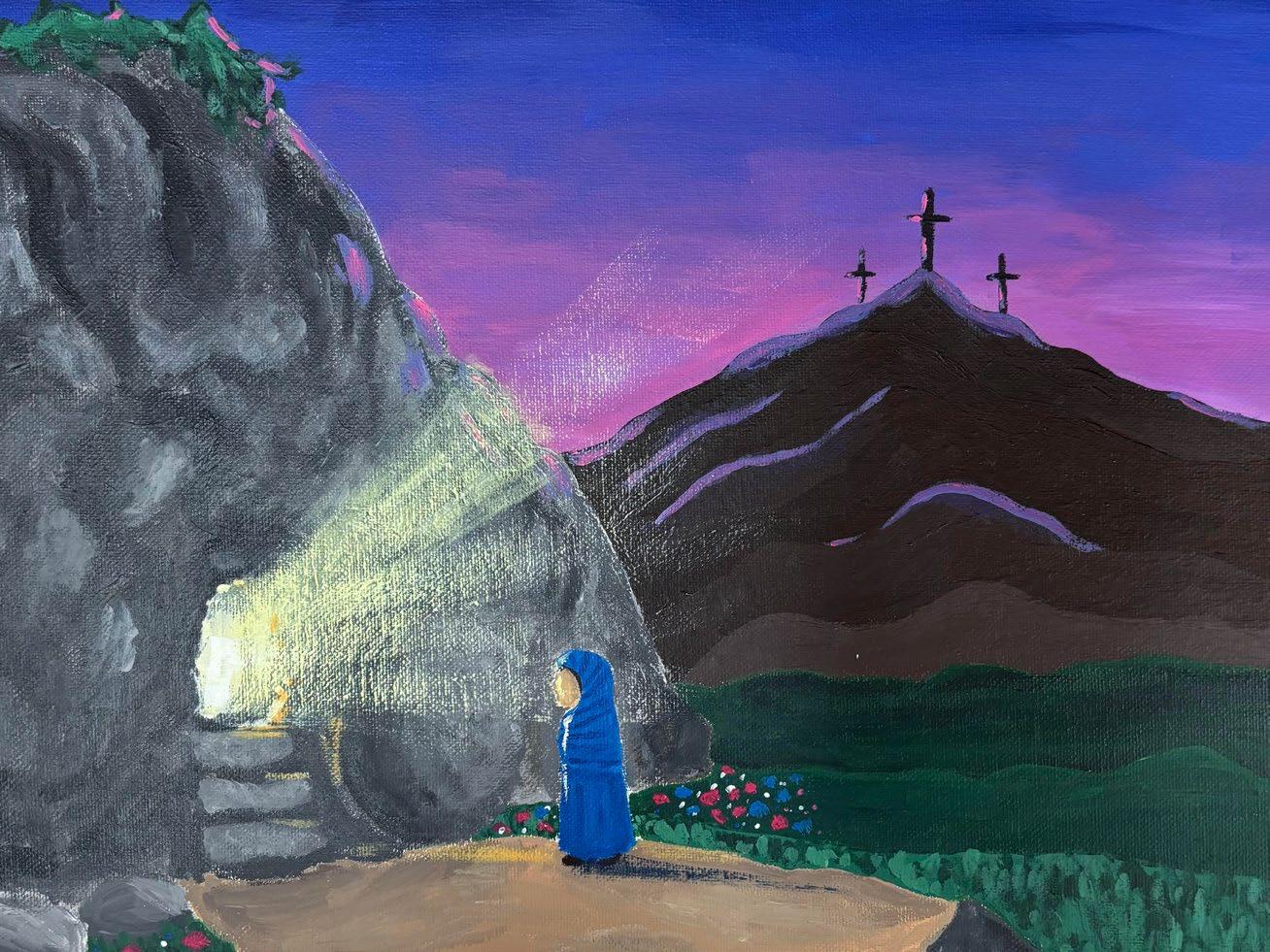In my painting, I depict Mary Magdalene walking towards the tomb, soon to discover that it is empty.