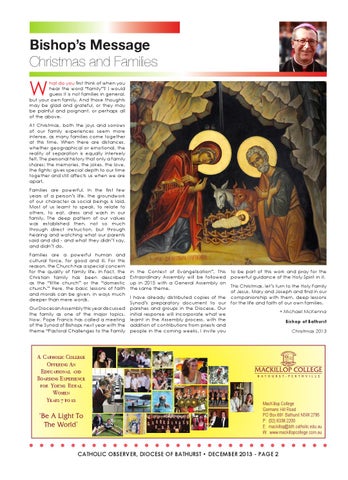 to be part of this work and pray for the powerful guidance of the Holy Spirit in it. This Christmas, let’s turn to the Holy Family of Jesus, Mary and Joseph and find in our companionship with them, deep lessons for the life and faith of our own families. + Michael McKenna Bishop of Bathurst Christmas 2013