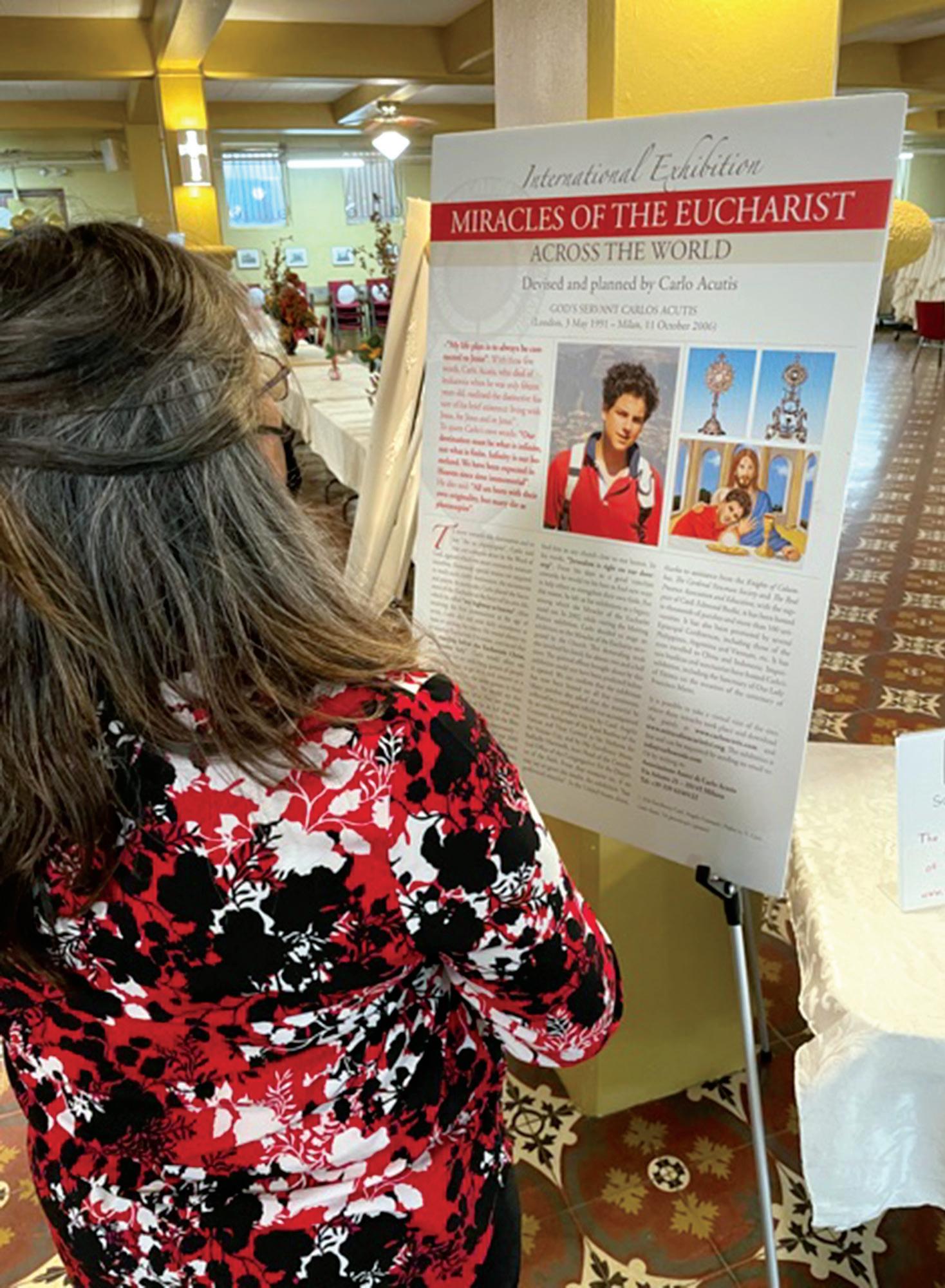 Una mujer lee sobre Carlo Acutis, el niño cuyo sitio web fue el origen de Los milagros eucarísticos del mundo.