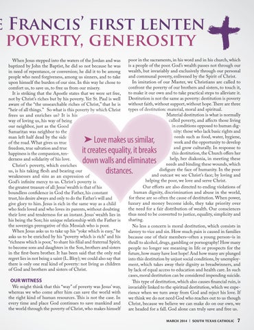 poor in the sacraments, in his word and in his church, which is a people of the poor. God’s wealth passes not through our wealth, but invariably and exclusively through our personal and communal poverty, enlivened by the Spirit of Christ. In imitation of our Master, we Christians are called to confront the poverty of our brothers and sisters, to touch it, to make it our own and to take practical steps to alleviate it. Destitution is not the same as poverty: destitution is poverty without faith, without support, without hope. There are three types of destitution: material, moral and spiritual. Material destitution is what is normally called poverty, and affects those living in conditions opposed to human dignity: those who lack basic rights and needs such as food, water, hygiene, work and the opportunity to develop and grow culturally. In response to this destitution, the Church offers her help, her diakonia, in meeting these needs and binding these wounds, which disfigure the face of humanity. In the poor and outcast we see Christ’s face; by loving and helping the poor, we love and serve Christ. Our efforts are also directed to ending violations of human dignity, discrimination and abuse in the world, for these are so often the cause of destitution. When power, luxury and money become idols, they take priority over the need for a fair distribution of wealth. Our consciences thus need to be converted to justice, equality, simplicity and sharing. No less a concern is moral destitution, which consists in slavery to vice and sin. How much pain is caused in families because one of their members–often a young person–is in thrall to alcohol, drugs, gambling or pornography! How many people no longer see meaning in life or prospects for the future, how many have lost hope! And how many are plunged into this destitution by unjust social conditions, by unemployment, which takes away their dignity as breadwinners, and by lack of equal access to education and health care. In such cases, moral destitution can be considered impending suicide. This type of destitution, which also causes financial ruin, is invariably linked to the spiritual destitution, which we experience when we turn away from God and reject his love. If we think we do not need God who reaches out to us though Christ, because we believe we can make do on our own, we are headed for a fall. God alone can truly save and free us. MARCH 2014 | SOUTH TEXAS CATHOLIC