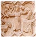 À gauche, représentation d’une scène biblique, le sacrifice d’Isaac, sur le portail central, côté Sud. À droite représentation d’une scène profane : une femme couronnée entraîne un homme nu, sur le portail central, côté Nord.