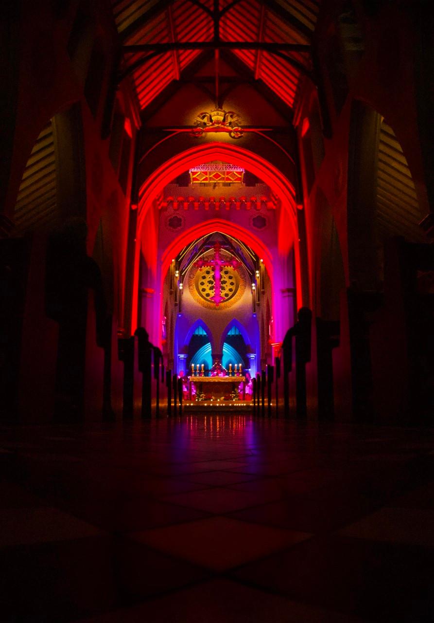 A simple yet spectacular light installation and experience was offered to visitors, highlighting the beauty of this A W N Pugin masterpiece The stunning arches and chapels were illuminated with beautiful colours, highlighting the depths and heights of this Gothic Revival build There were gasps of joy as newcomers walked through this captivating experience Those familiar with the Cathedral commented on how the lighting had moved the space from two-dimensional to something much more threedimensional Throughout the evening, visitors were treated to choral and organ performances, with a number of visitors commenting that the music really completed the experience for them As visitors passed the Sanctuary on their way out, they were offered the opportunity to light a candle- on Saturday evening, over 500 candles were aglow on the Sanctuary steps. Many were visibly moved by the beauty and splendour of what a number of visitors called a ‘hidden gem’ in the city, and volunteers were encouraged to do more to share and showcase it.