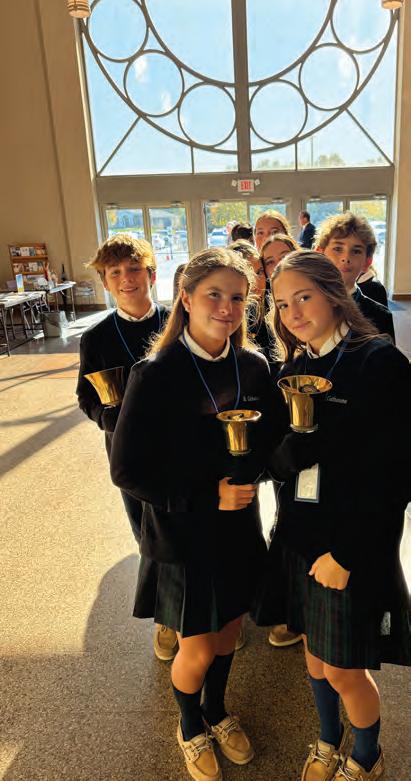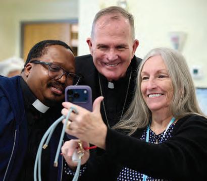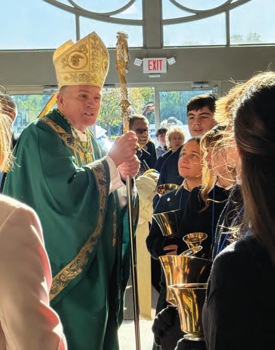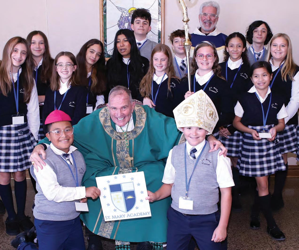 Bishop David M. O’Connell, C.M., poses for a lighthearted photo with students from St. Mary Academy, Manahawkin, after the Oct. 16 Catholic Schools Mass. Coverage begins on page 36. John Batkowski photo