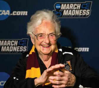 For many Americans, Sister Jean became a household name during Loyola’s stunning run to the 2018 NCAA Final Four, when she was 98 years old. Sitting courtside in her maroonand-gold scarf, she offered pregame prayers, postgame analysis and the occasional strategic suggestion – earning the affection of fans, players, and coaches nationwide. Beyond basketball, Sister Jean led weekly student prayer groups and founded SMILE (Students Moving Into the Lives of the Elderly).
