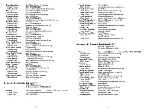 Rev. Msgr. Donald P. Schmitz (507) 282-8542 x119 father.schmitz@paxchristichurch.org Deacon Christopher Orlowski (507) 282-8542 x111 deacon@paxchristichurch.org Mark Oldenburg (507) 282-8542 x104 parishadministrator@paxchristichurch.org Sr. Jan Reisdorf (507) 282-8542 x128 jan.reisdorf@paxchristichurch.org Maureen Weber (507) 282-8542 x100 receptionist@paxchristichurch.org Carol deLongpre (507) 282-8542 x103 Joyce Lehman - grds 1-5 (507) 282-8542 x108 elementary@paxchristichurch.org Jessica Scully (507) 282-8542 x105 jessica.scully@paxchristichurch.org Angie Slattery (507) 282-8542 x107 angie.slattery@paxchristichurch.org Zach Rawson (507) 282-8542 x126 zach.rawson@paxchristichurch.org Teresa Farley-Severson teresa.severson@paxchristichurch.org Mark Oldenburg Joe Kelley (507) 282-8542 x109 liturgist@paxchristichurch.org Mark Scheitel music@paxchristichurch.org (507) 272-9756 Zach and Suzanne Rawson skastuto@comcast.net