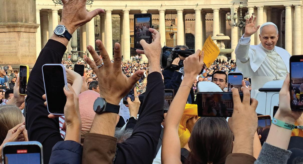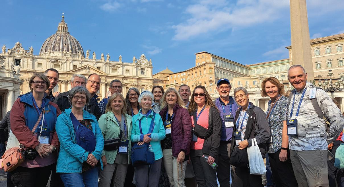 A gr�u� �f 14 S�. M�ry's, W�n�n�, ��r�s���ners made a Jubilee Pilgrimage of Hope to Italy October 13-23. Their tour guide photographed them visiting St. Peter's Square for Pope Leo's October 15 General Audience. JULIE FITZGERALD took the lower left photo, and SANDY SCHILTZ took the close-up.