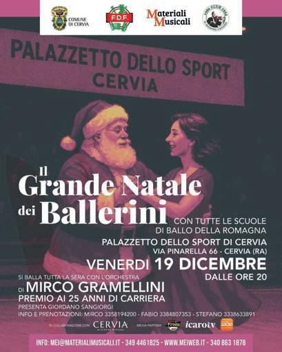 Si terra’ a Cervia, che diventa cosi la piu’ grande Balera di Romagna per le Fesetivita’ di Natale,venerdì 19 dicembre a partire dalle ore 20 al Palazzetto dello Sport di Cervia, il primo Grande Natale dei Ballerini a cura della Federazione Danze Folk, la piu’ grande federazione delle migliori scuole di ballo della Romagna, sui ritmi del’orchestra di Mirco Gramellini.