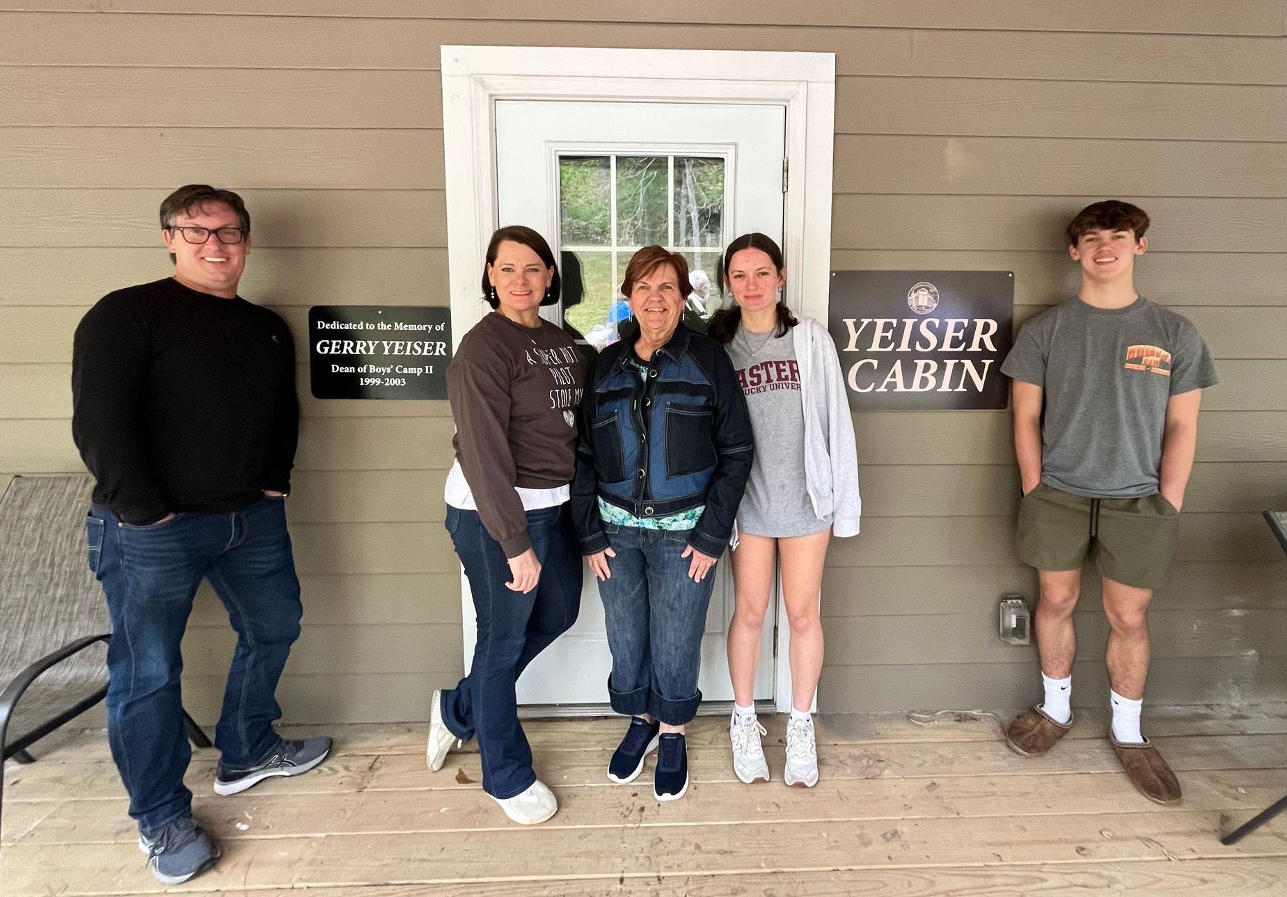 Mary T. Yeiser poses at the new Yeiser Cabin with some of her family, including Spencer and Therese Yeiser Smith, her son-in-law and daughter, and grandchildren Oliva and Jackson Smith.