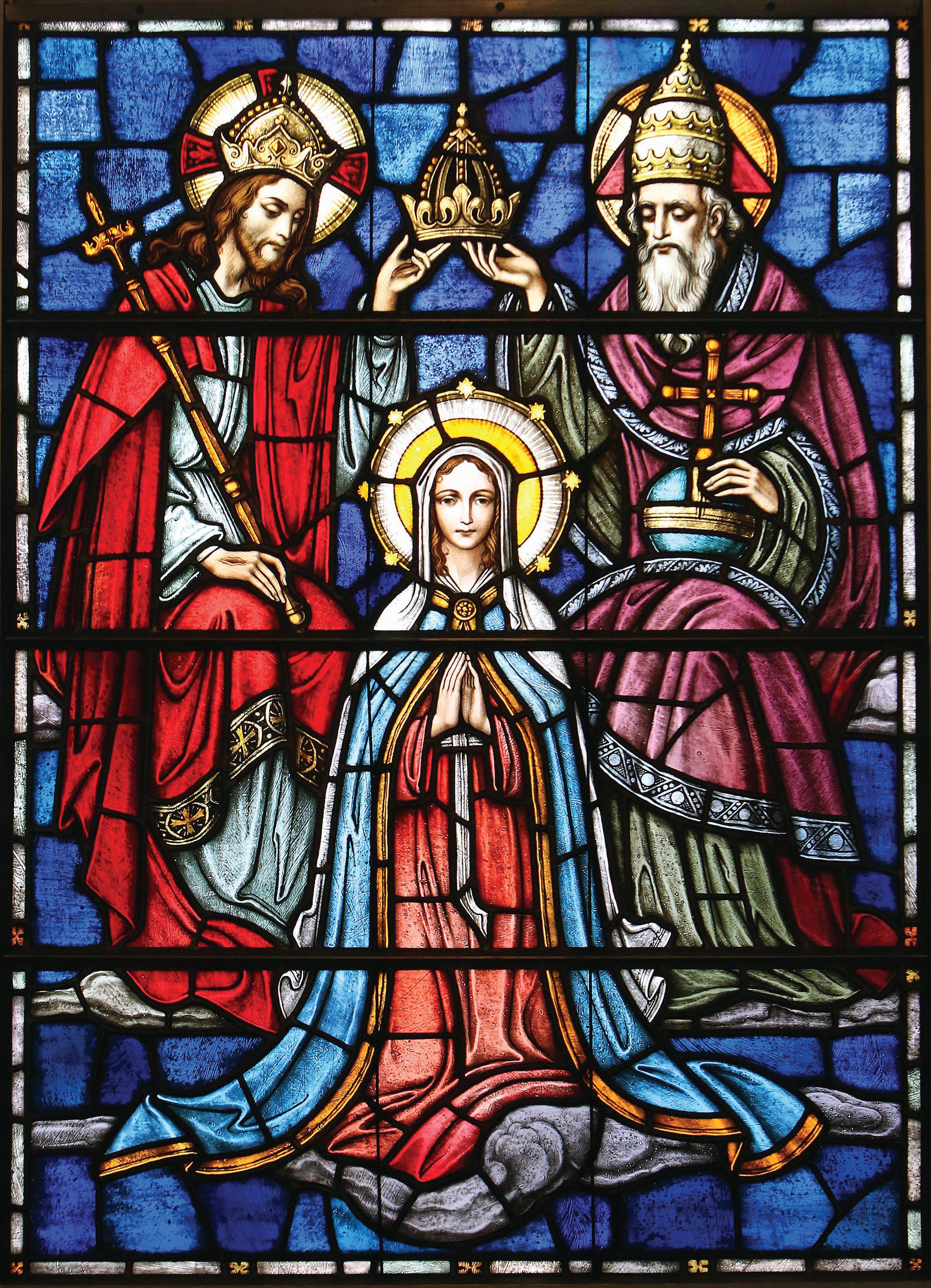 The coronation of Mary in Heaven is depicted in a stained-glass window at Our Lady of Mercy Church, Hicksville, N.Y.