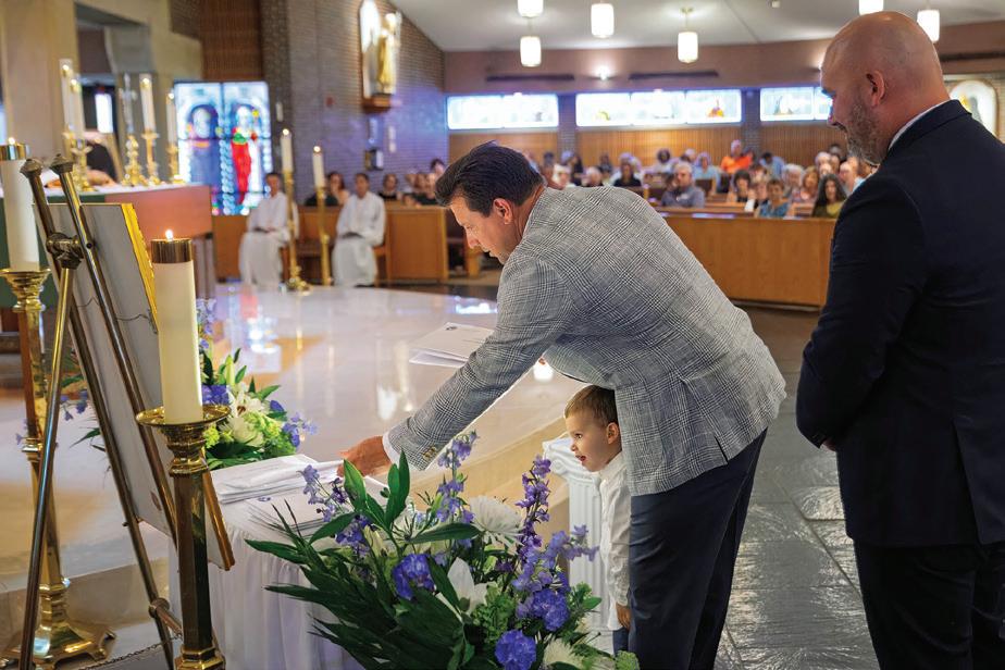 4. Bobby Beaton and his son, Austin, present prayer petitions before Daniel’s photo. Beaton came to know Daniel as a former police officer who worked with the federal marshals for Daniel’s funeral. At right, waiting to leave petitions, is St. Augustine School Principal Edward Modzelewski, who also taught Daniel. —Hal Brown photos