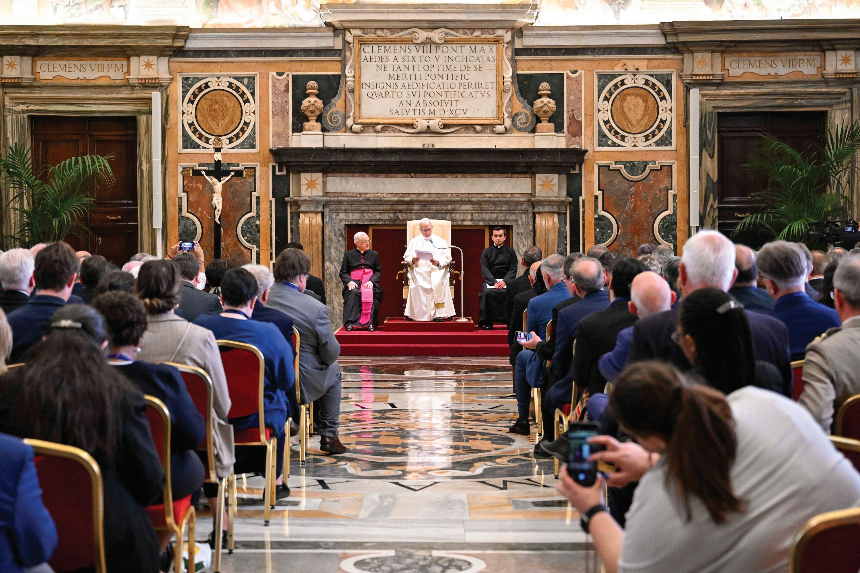 Pope Leo XIV speaks to leaders of 115 international Catholic associations, ecclesial movements and new communities in the Vatican’s Clementine Hall June 6, 2025. —CNS photo/Vatican Media