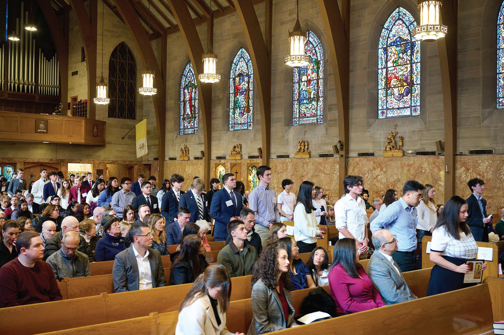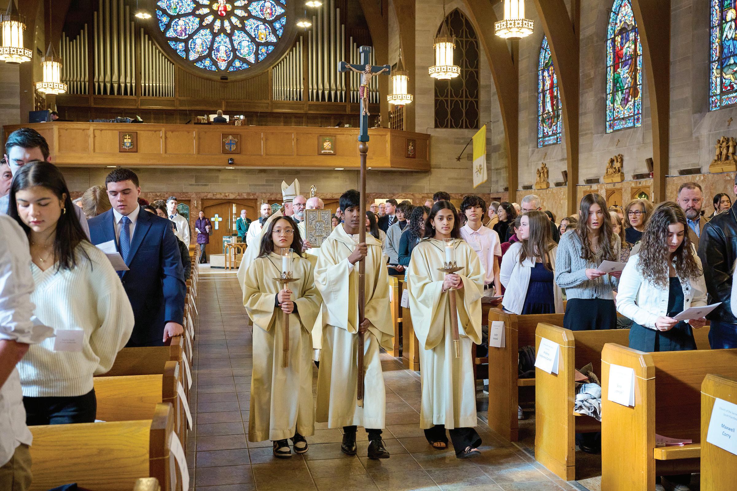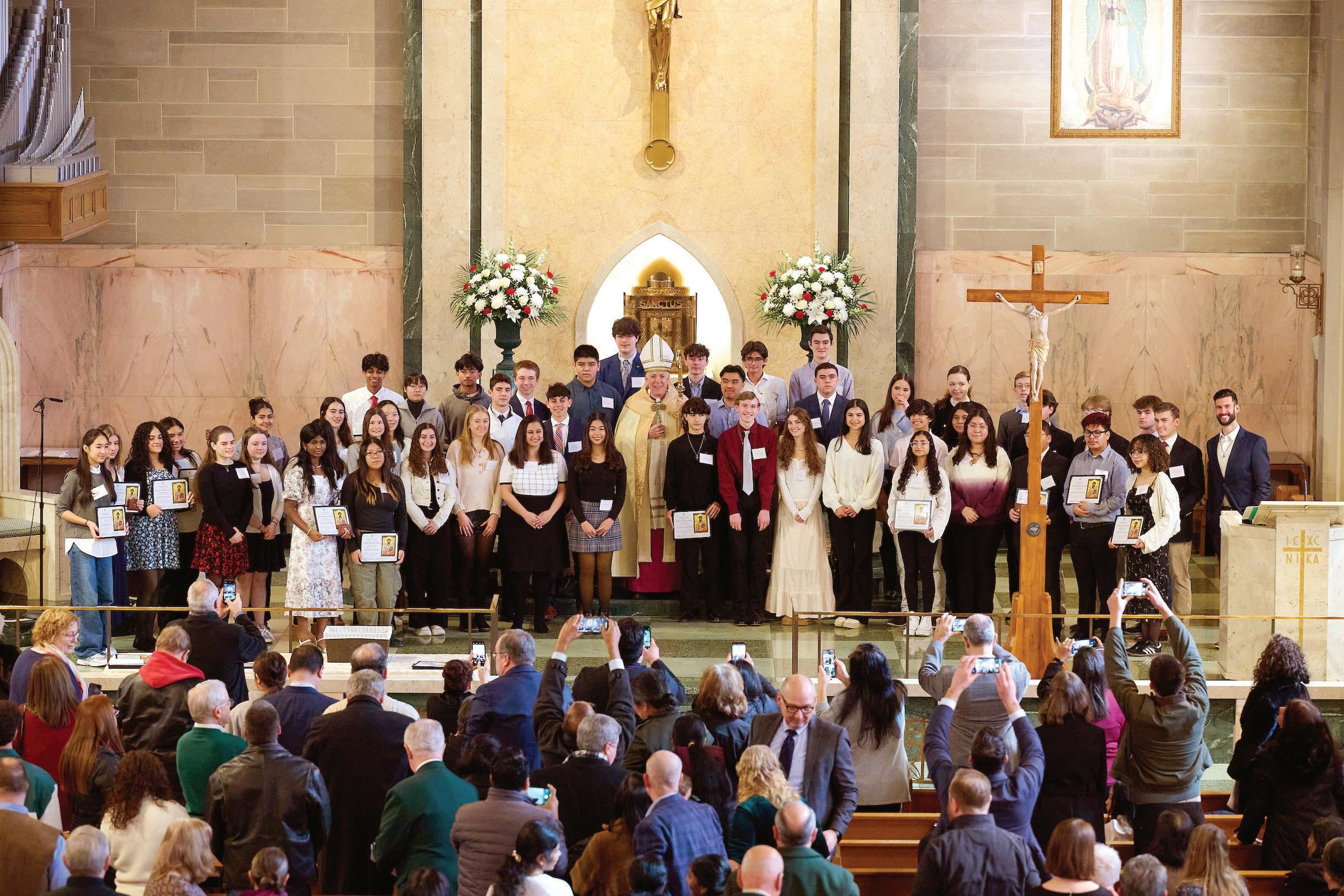Bishop James F. Checchio addressed the 56 teens seated before him in the Cathedral of St. Francis of Assisi Jan. 25 for the annual St. Timothy and St. Teresa Awards ceremony sponsored by the diocesan Office of Youth and Young Adult Ministry. With admiration for their lengthy spiritual resumes and generosity of heart, he told the high school students, “You have been faithful witnesses to our Lord. You are in service to neighbor in proclamation to the Gospel [and] give us a model of Christian discipleship.”