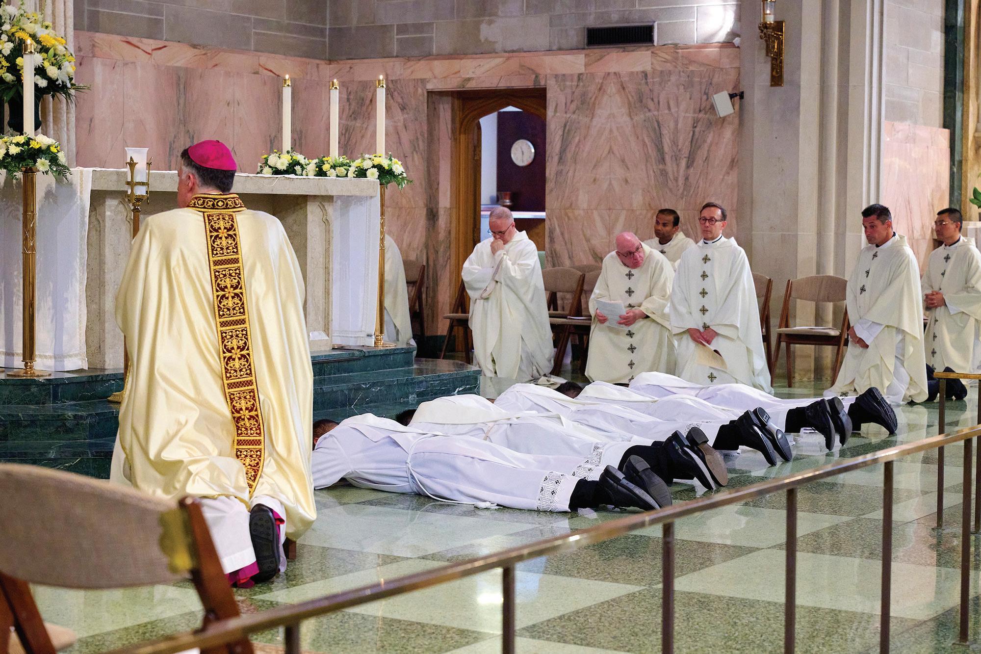 1. Deacons Joseph Ho, Randy Gamboa Espinoza, Dawid Malik, Larrydom Magdasoc and Peter Phan, stand in the sanctuary in the Cathedral of St. Francis of Assisi, Metuchen, June 8, before Bishop James F. Checchio and the congregation who express their assent through their applause to the men who have been chosen for Ordination to the Priesthood. 2. More than 100 priests of the Diocese, along with others hailing from various parts of the state and country, helped fill the Cathedral of St. Francis of Assisi to celebrate the men who would become priests. 3. The five deacons prostrate themselves on the floor of the sanctuary as a sign of humility while the congregation and choir sing a litany invoking Jesus and all holy men and women to pray for them. 4. In silence, Bishop Checchio lays hands on the head of Deacon Espinoza, calling down the Holy Spirit on the one to be ordained. Ordination takes place with the laying on of hands and the following Prayer of