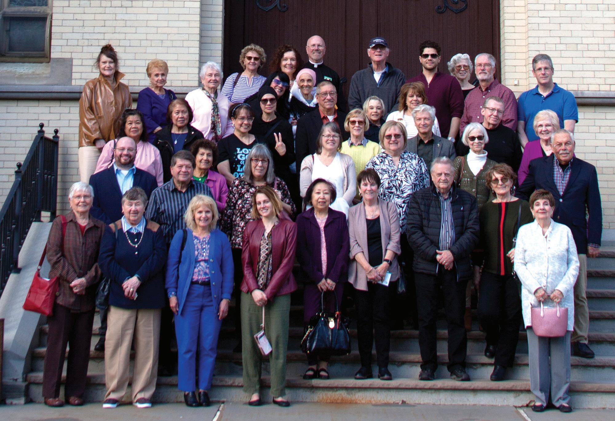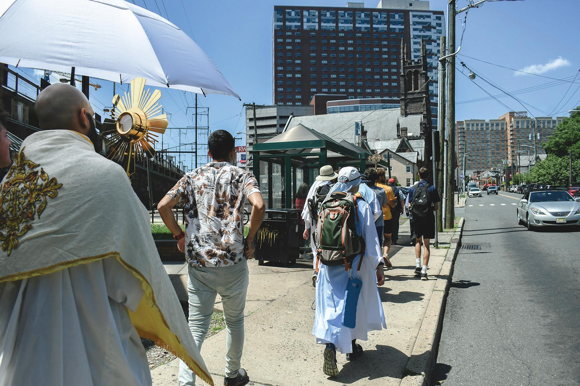 Six perpetual pilgrims and friends rest on the steps of St. Peter the Apostle University and Community Parish, New Brunswick on the second of three stops of the National Eucharistic Pilgrimage traveling the Seton Route through the Diocese. See our complete caption, pg. 2; pilgrimage coverage pgs. 6-8, 48 —Gerald Wutkowski Jr. photo