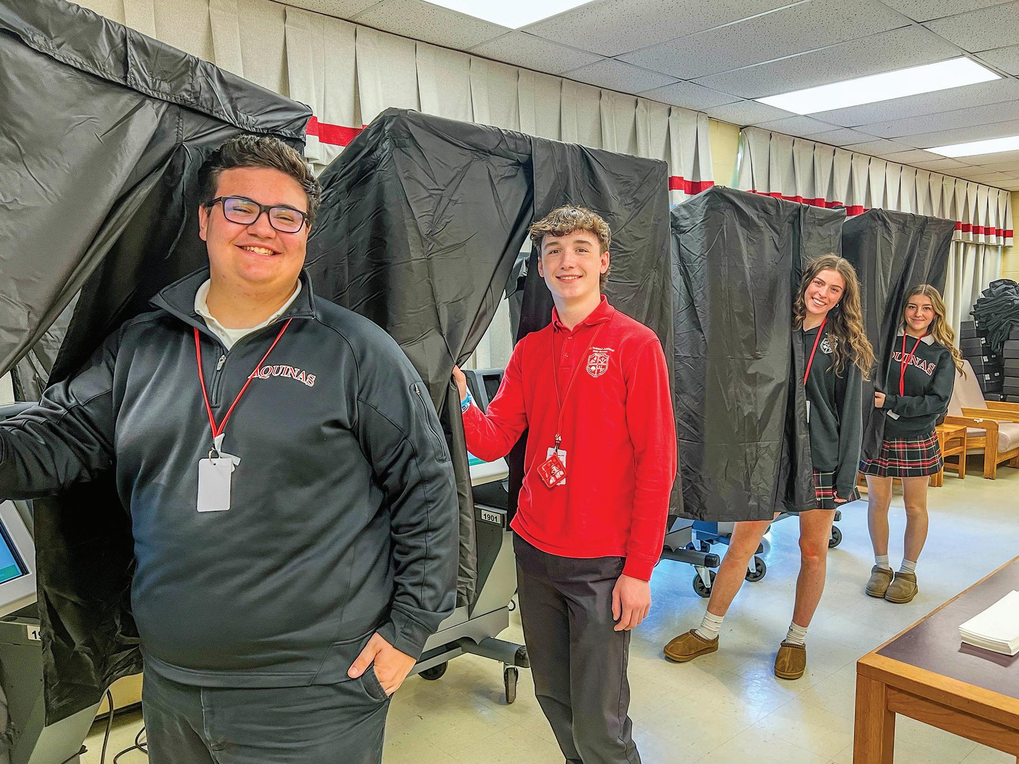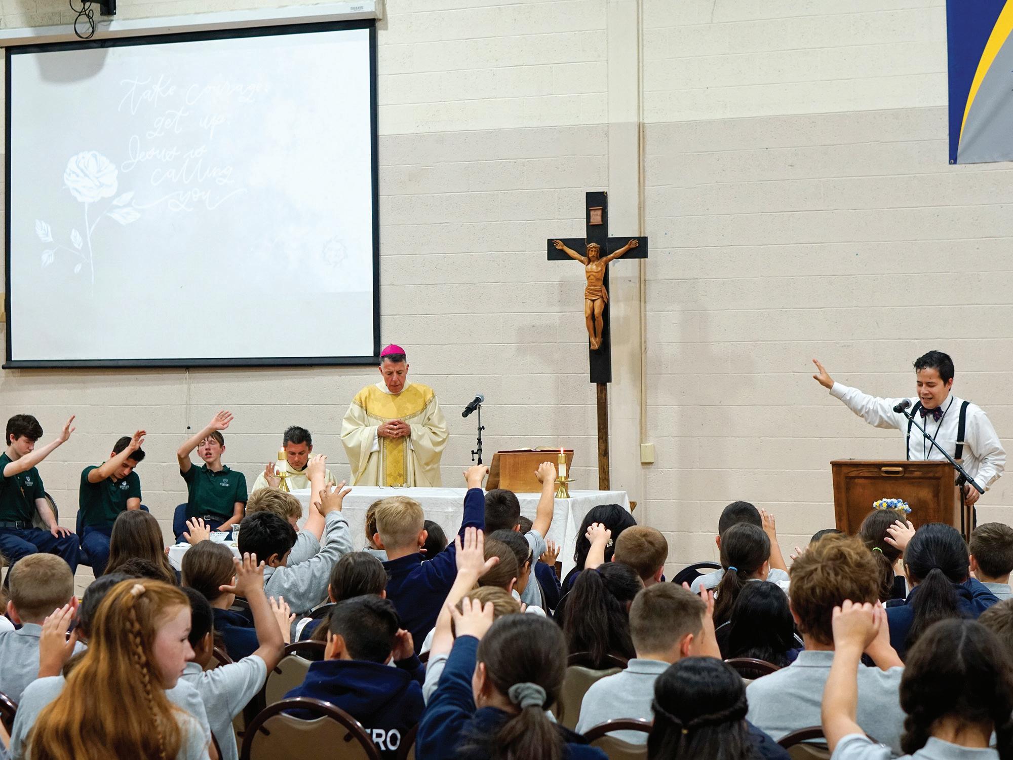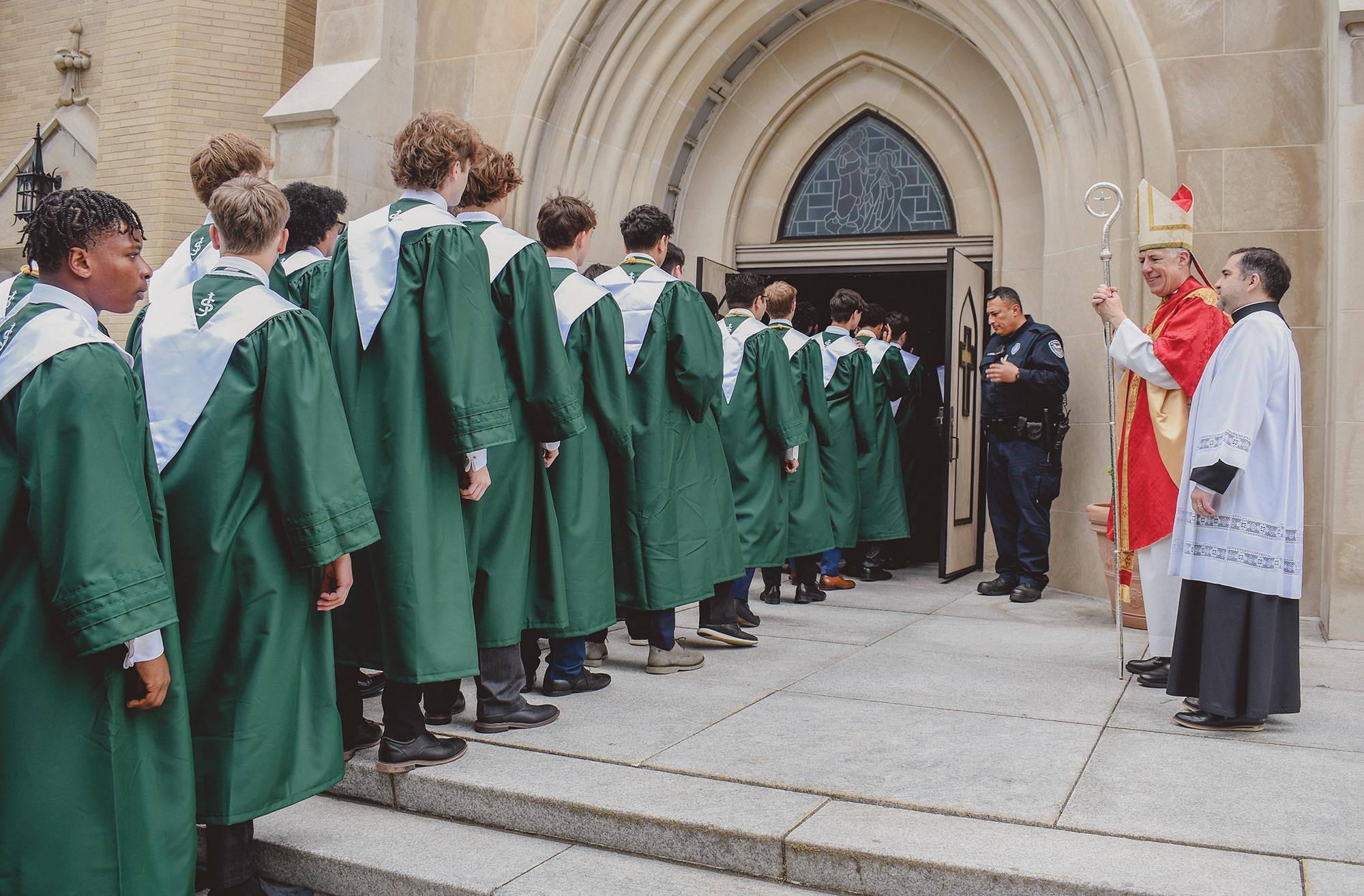 Bishop Checchio is blessed by students during his May 31 visit to Koinonia Academy with Father Tom Lanza, diocesan vocations director, where Bishop celebrated Mass and met with the school community. —Koinonia Academy photo