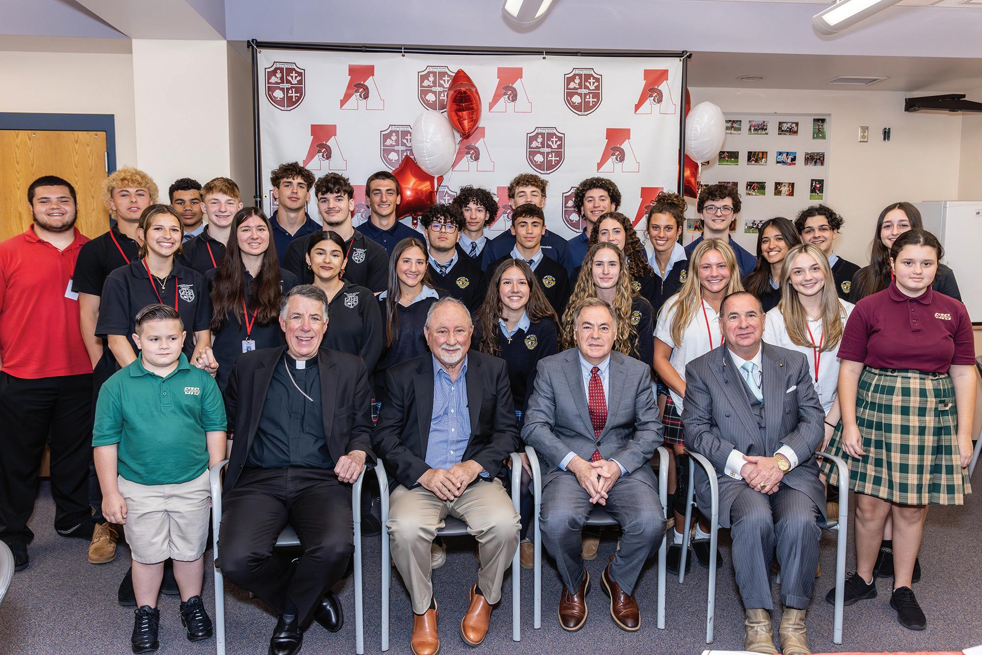 Bishop James F. Checchio joins members of the Tri-State Italian-American Congress on May 28 in St. Thomas Aquinas High School, Edison, for the distribution by the Congress of $40,000 in scholarship monies to 40 students in four schools of the Diocese, including Immaculata High School, Somerville; St. Thomas Aquinas High School, Edison; St. Joseph School, Carteret and Sts. Philip and James School, Phillipsburg. Providing educational opportunities for Italian-American children is one of the goals of the Congress. —Hal Brown photo