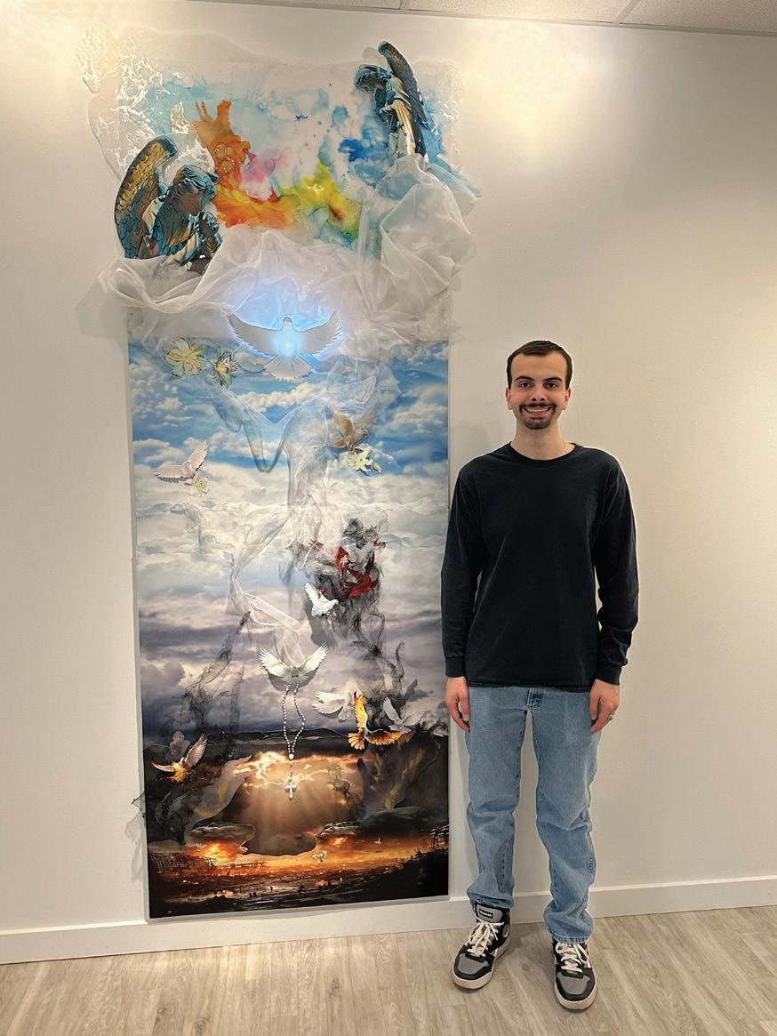 Below left, artist Benjamin Fernandez, a student in Caldwell University, stands with his mixed-media wall hanging work on canvas, entitled “Prayer for Peace,” during a special private presentation and showing of an exhibit of his senior thesis, “Transfiguration,” inspired by the charism of the university’s founders, the Sisters of St. Dominic of Caldwell, and held in the university’s Mueller Gallery April 18.