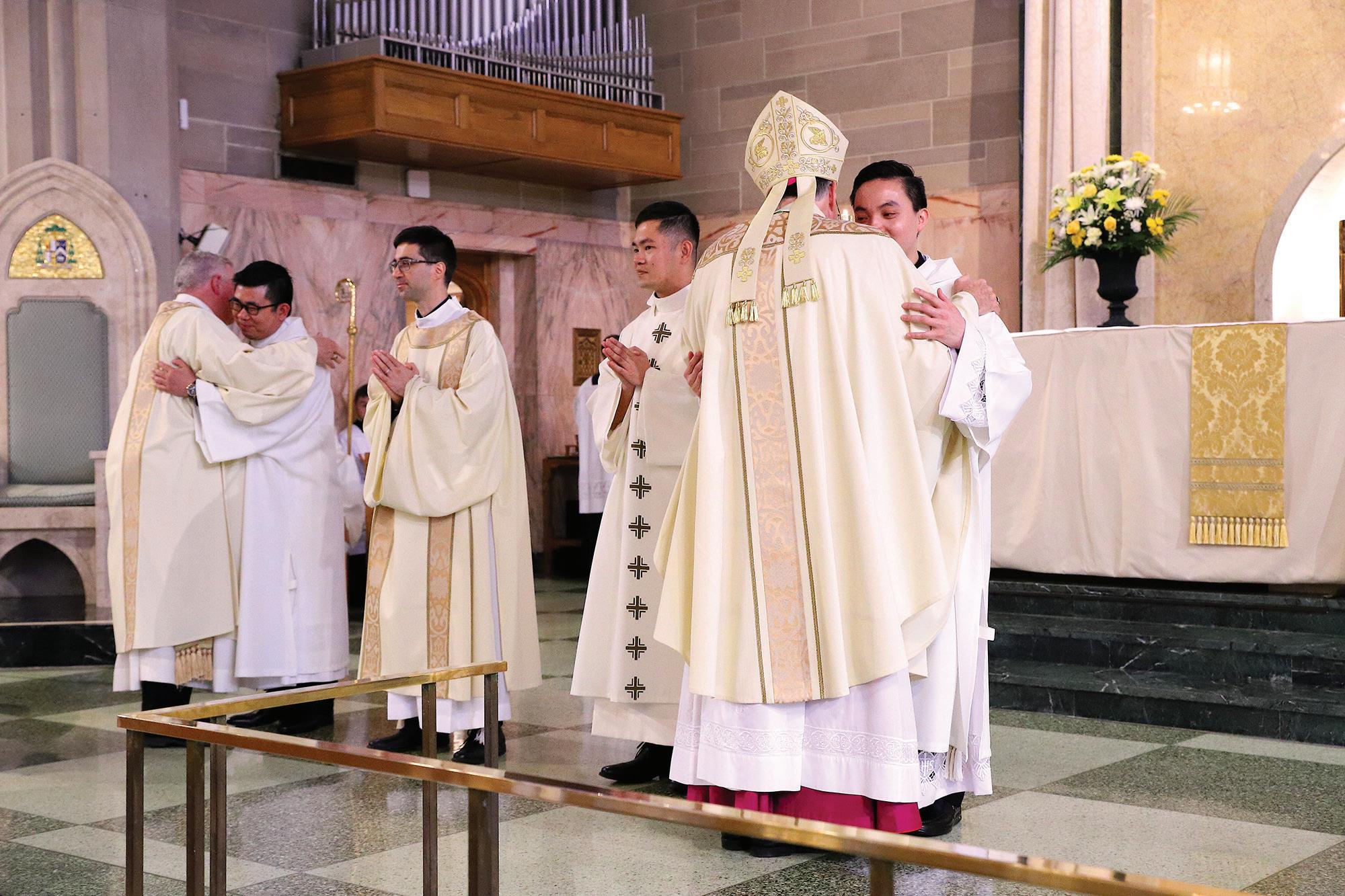 op extended a sign of peace, while priests and deacons embraced the men who had just been added to their brotherhood.