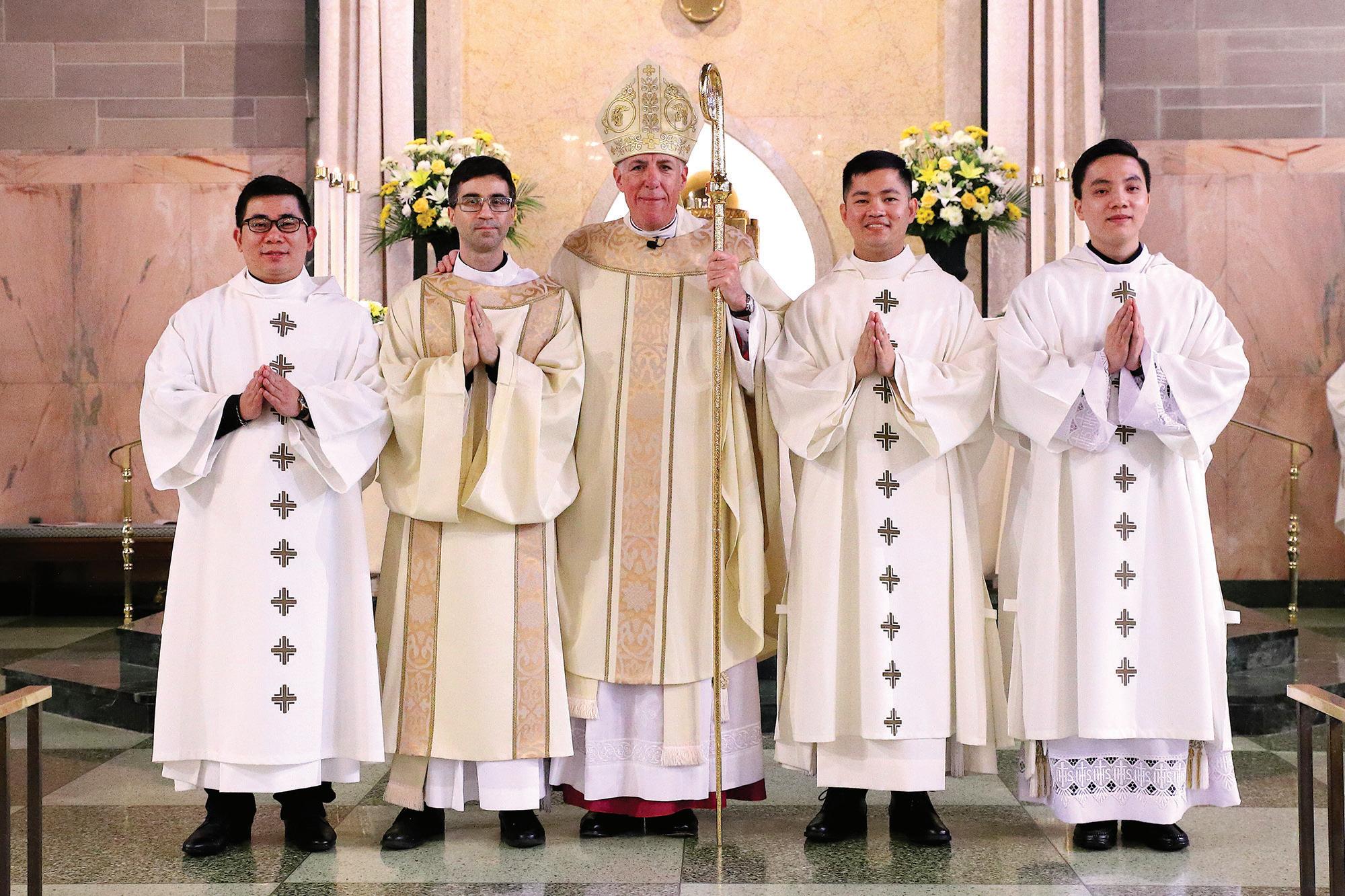 The rite of ordination began with Bishop Checchio beckoning forward the prospective deacons: Ban Thien (Joseph) Ho, Larrydom Jr. K. Magdasoc, Dawid Jan Malik and Ai Van (Peter) Phan. Msgr. John N. Fell, director, diocesan Office for Priest Personnel, and director of Seminarians, affirmed to the bishop that the men were prepared for their new ministry and worthy of the responsibility they would be undertaking.