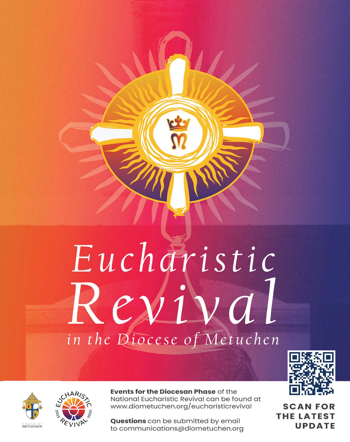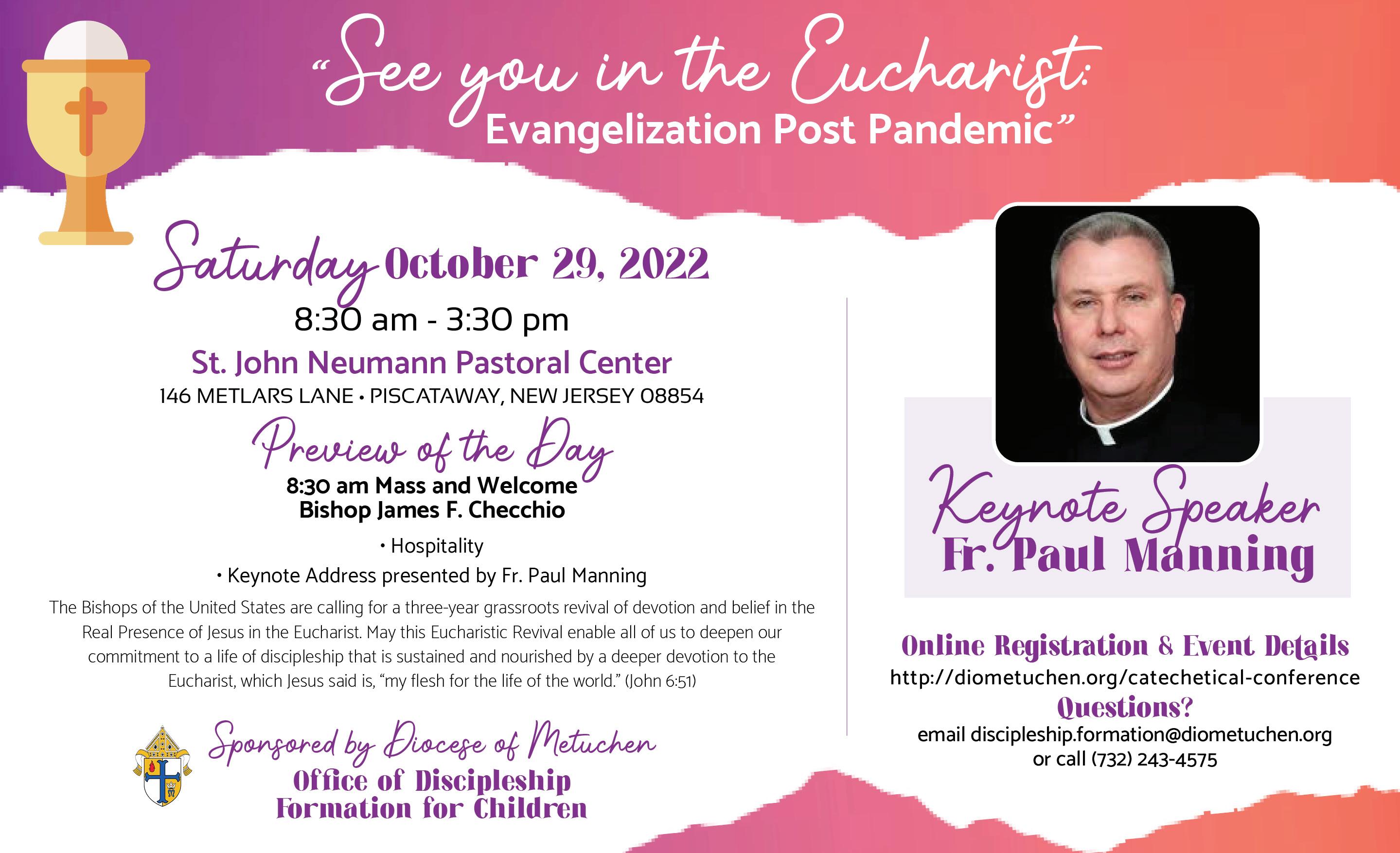 10/29 2022 Catechetical Conference, “See You in the Eucharist: Evangelization Post Pandemic!” PCLs, Catechists, Principals and teachers are invited. Keynote speaker will be Father Paul Manning, Episcopal Vicar for Evangelization in the Diocese of Paterson, a known presenter and advocate for the New Evangelization. The day will open with Mass celebrated by Bishop James F. Checchio. For more information contact: Carol Mascola at cmascole@diometuchen.org