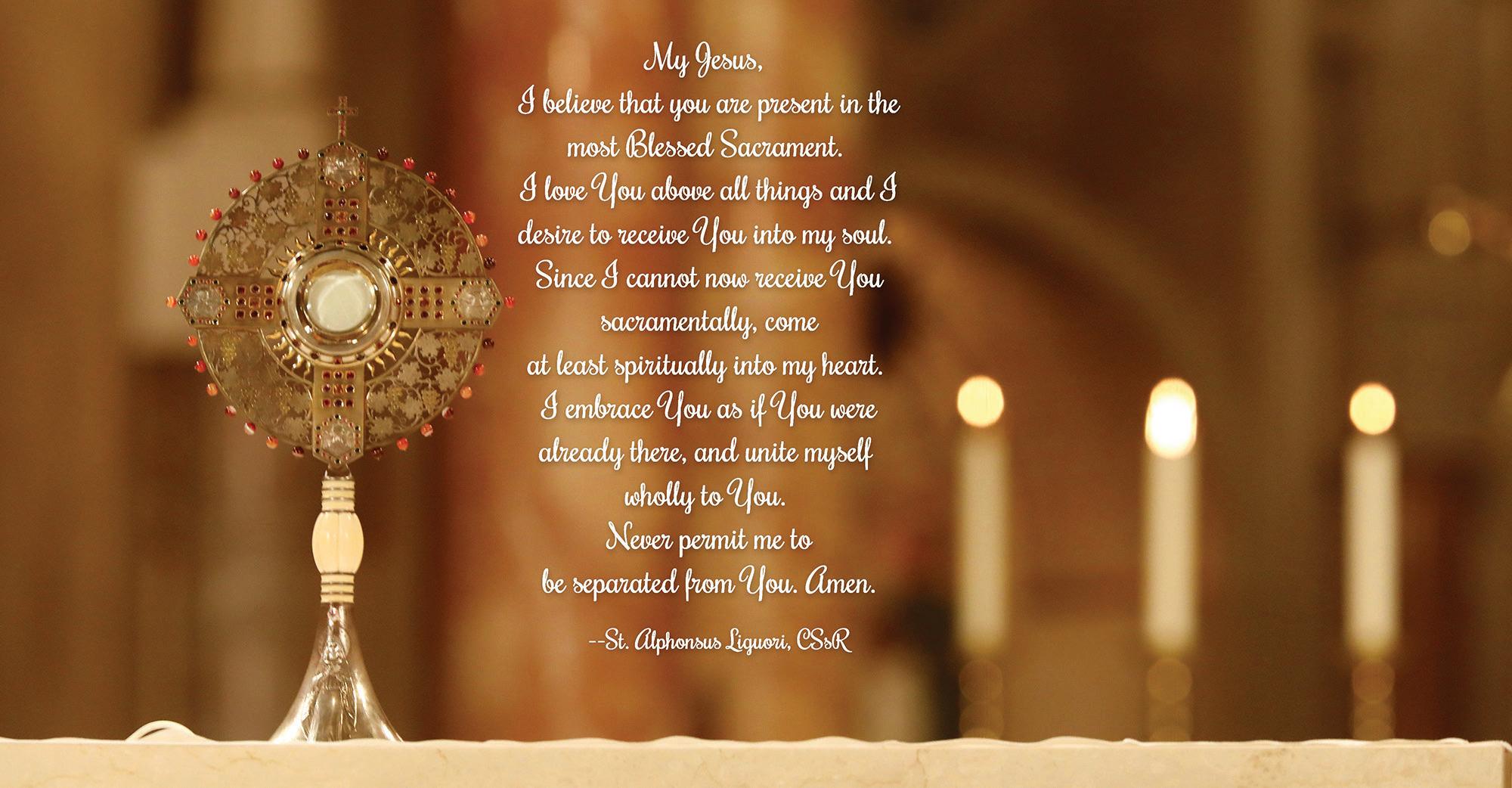 A monstrance is pictured during Eucharistic adoration at the Basilica of the National Shrine of the Immaculate Conception in Washington D.C. The Prayer of Spiritual Communion written by St. Alphonsus Liguori has been superimposed on the photo. OSV News photo/Bob Roller