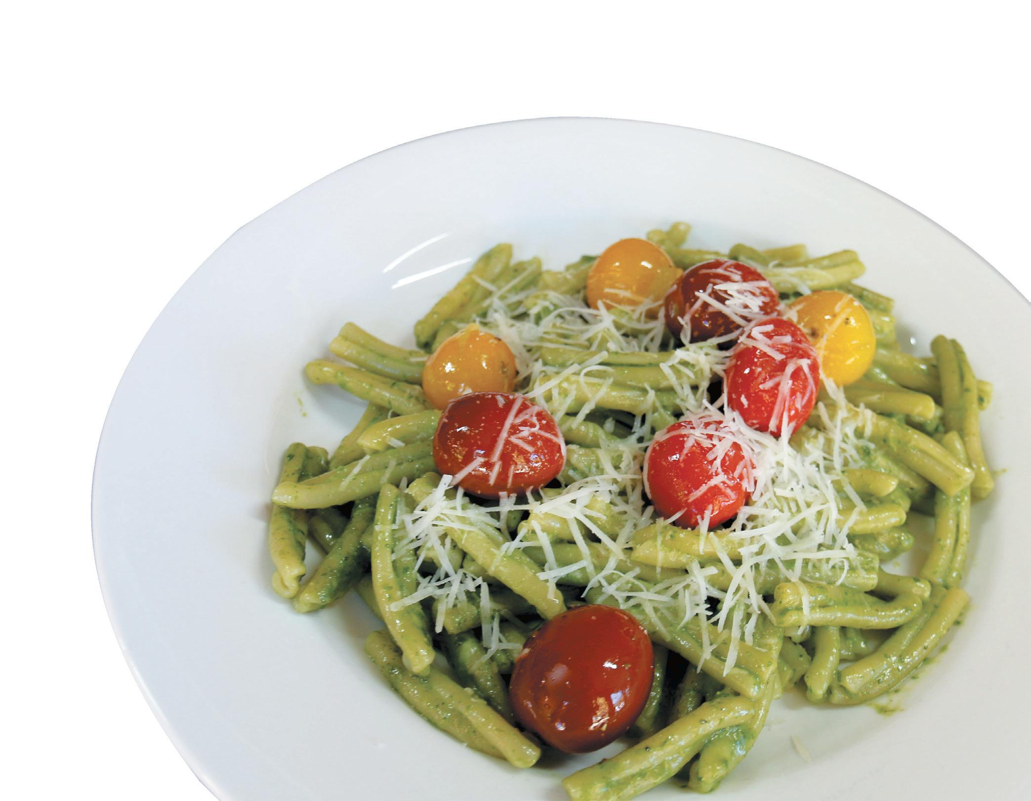 To make the pesto in advance (it keeps in the fridge for 4 days), place the pine nuts, cheeses, garlic and oil into a blender or food processor. Blend until mixture has a white pasty texture. Add basil leaves slowly. Blend together, then add butter and season. Cook pasta according to packet directions. Bake or pan-fry tomatoes in oil until softened.