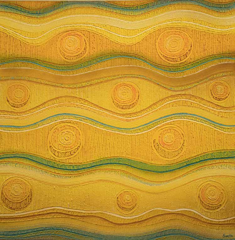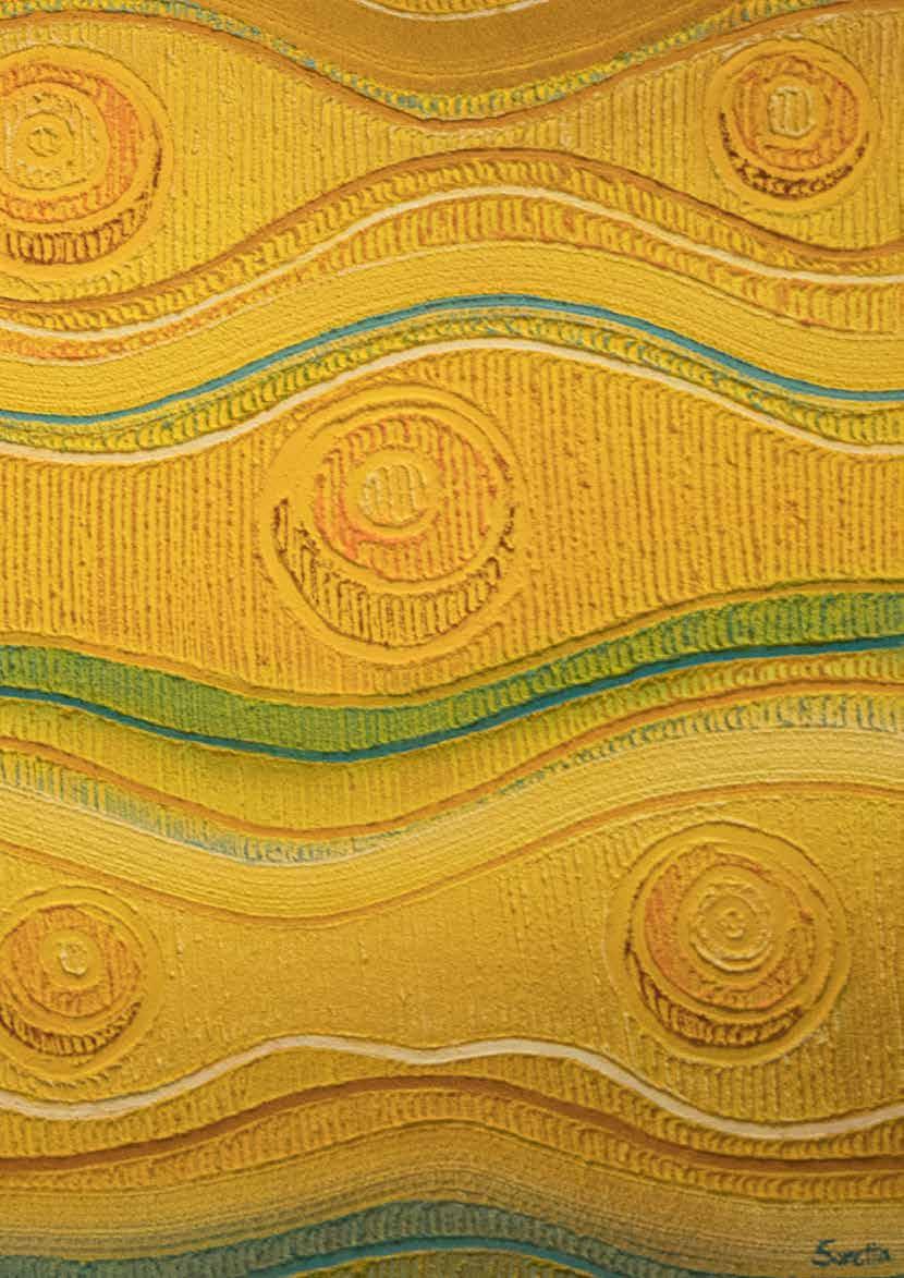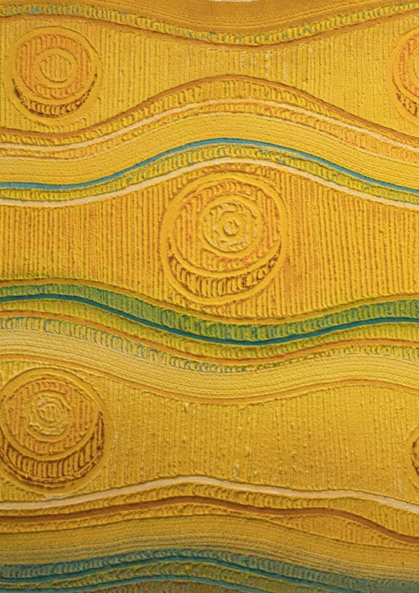 Pathways flowing across the canvas depict the valuable journey of education, reflective of the Catholic Schools Office. Pathways, together with the gathering circles are reflective of coming together for the 2019 NSW Aboriginal & Torres Strait Islander Education Conference and highlights the event’s footprint on