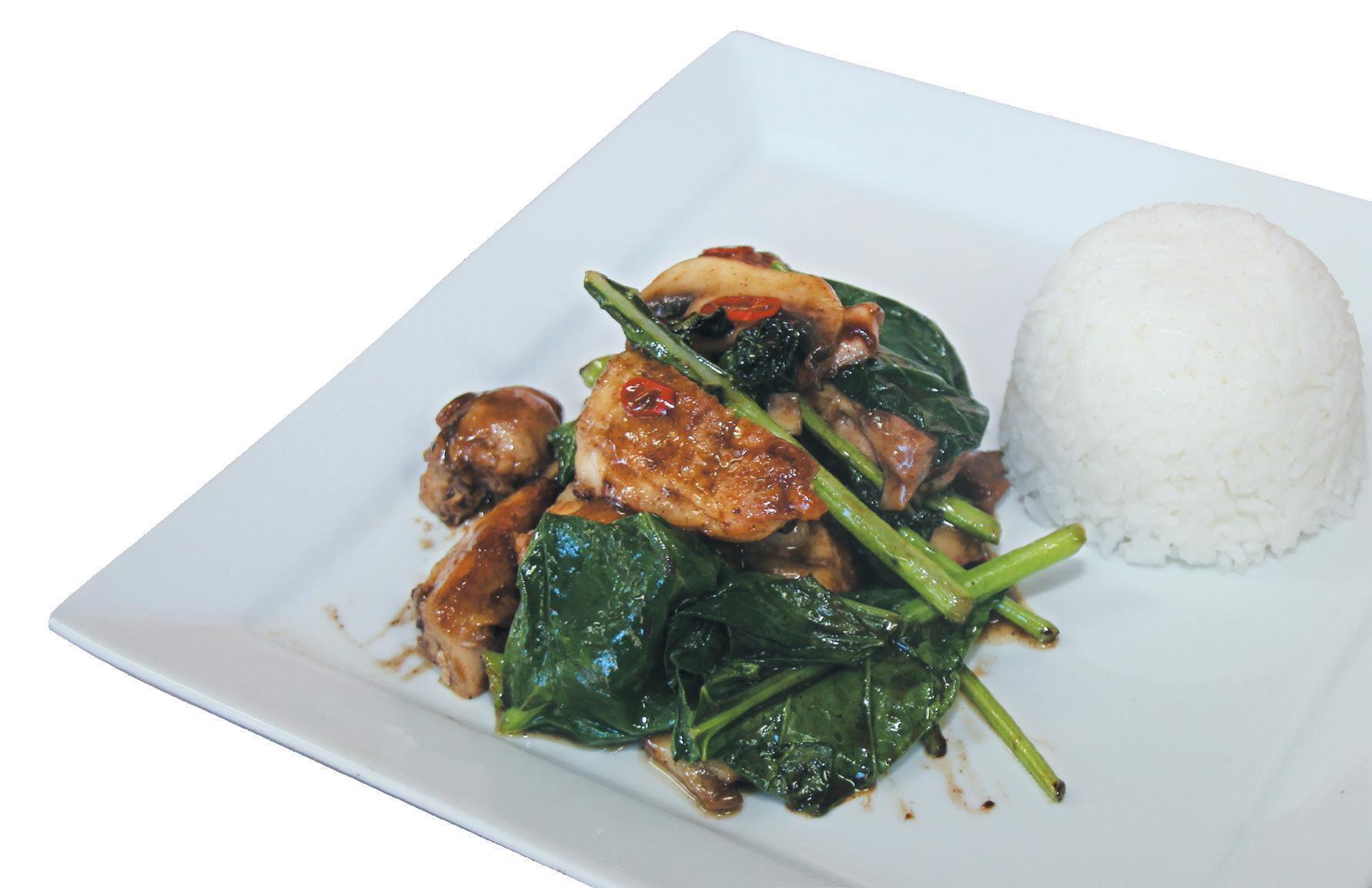 In an ovenproof frying pan, sear the chicken, skin side down, in a splash of oil over medium heat. Place in oven and cook for 15–20 minutes. Turn chicken over so skin is now facing up and put back in the oven for 5 minutes to crisp the skin. Remove chicken and allow to rest and cook slightly, then cut meat from the bone in chunks. Add a dash of oil to a wok or frying pan over medium-high heat and add chicken and mushrooms. Sauté for a few minutes then add remaining ingredients. Cook, tossing, for a few minutes and serve with either boiled rice or your favourite Asian noodles.