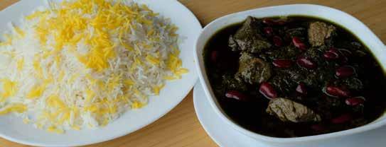 9 As the stew nears the 3-hour mark, remove the lid and check the meat; it should be very tender. If the ghormeh sabzi seems a little watery, leave it uncovered for the last 20 minutes of cooking and allow to reduce into a thick stew. Taste and adjust the seasoning with salt and pepper. If the stew needs a little acidity, juice a lime into the stew through a sieve by pressing down on it with a spoon (avoid letting the seeds through the sieve, as they can be bitter). Set aside. Taste the stew and continue adding more lime juice until the stew is sufficiently tangy. Stir in the saffron. The stew should be a very deep, dark shade of green and quite thick when done. Return dried limes into the stew to serve.